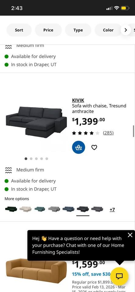 VenmoKIVIK Ikea sofa; 3-4 seat with chaise. Dark grey. Original price $1399. Will need to remove chaise for transport but will send you with tools to put back together.