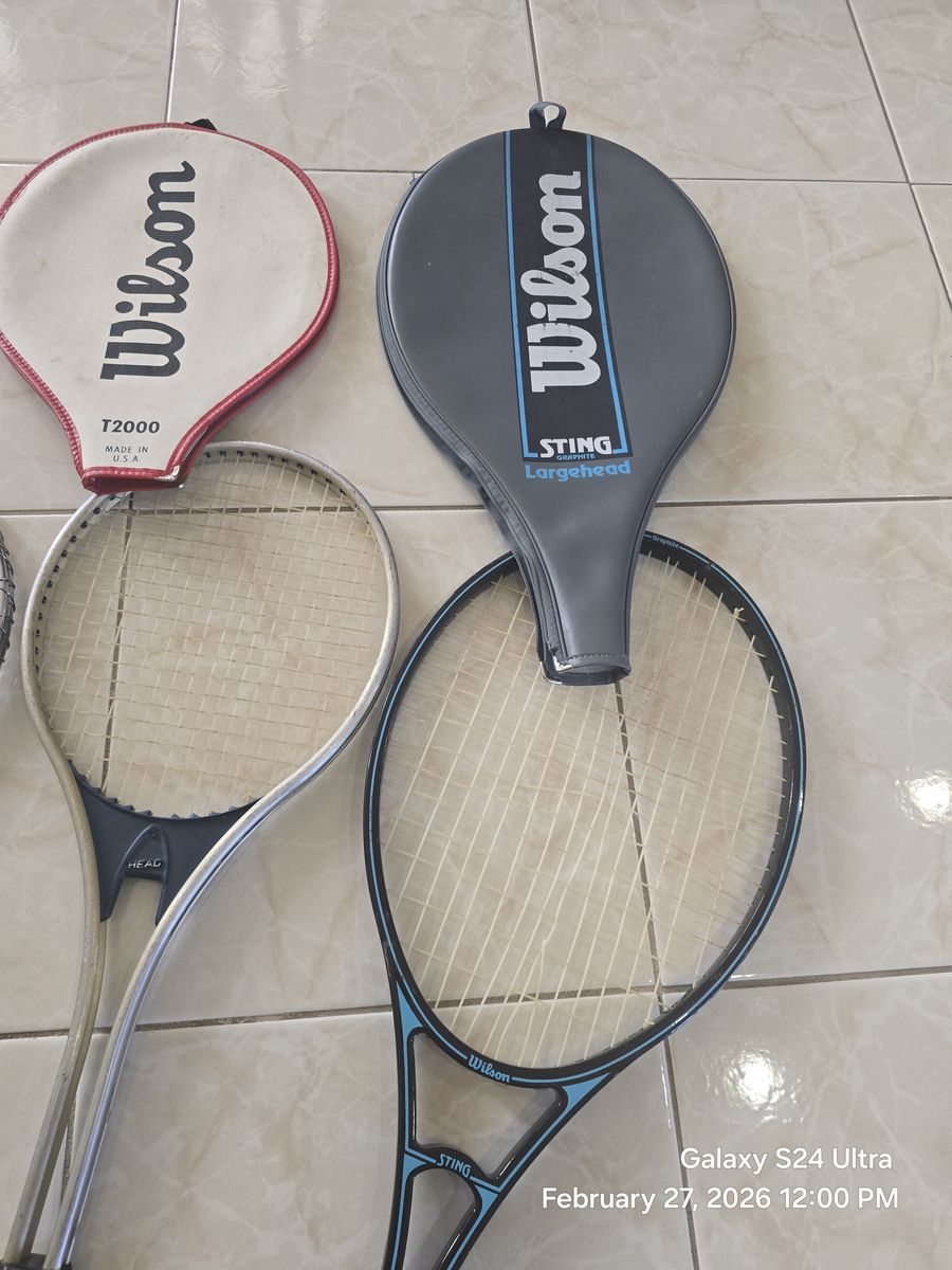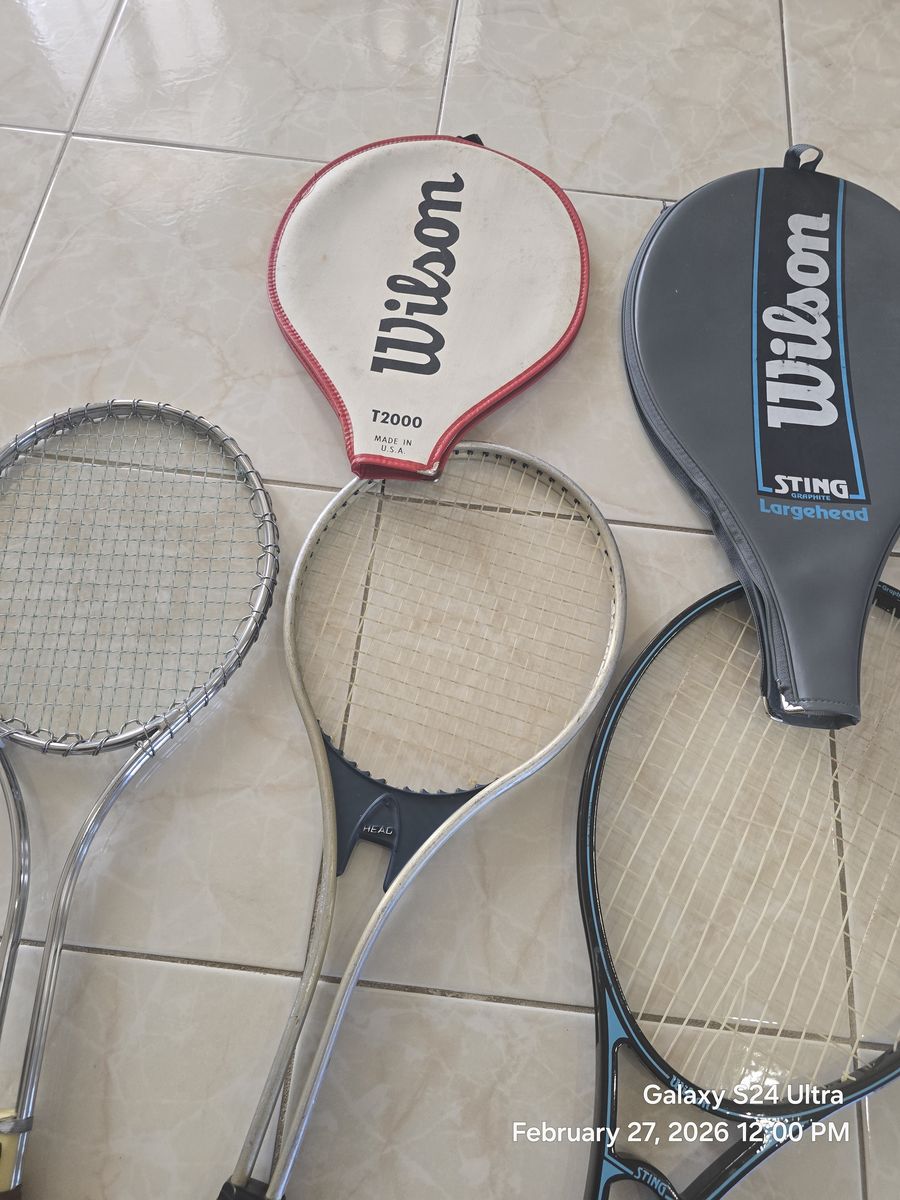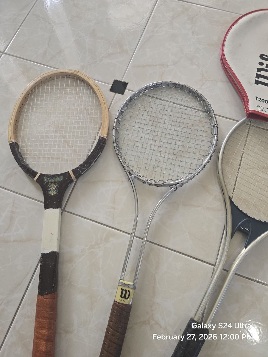 VenmoFOUR tennis rackets including a a vintage wood one. The large Wilson one will need to be re-strung. the other two metal ones are pro models.