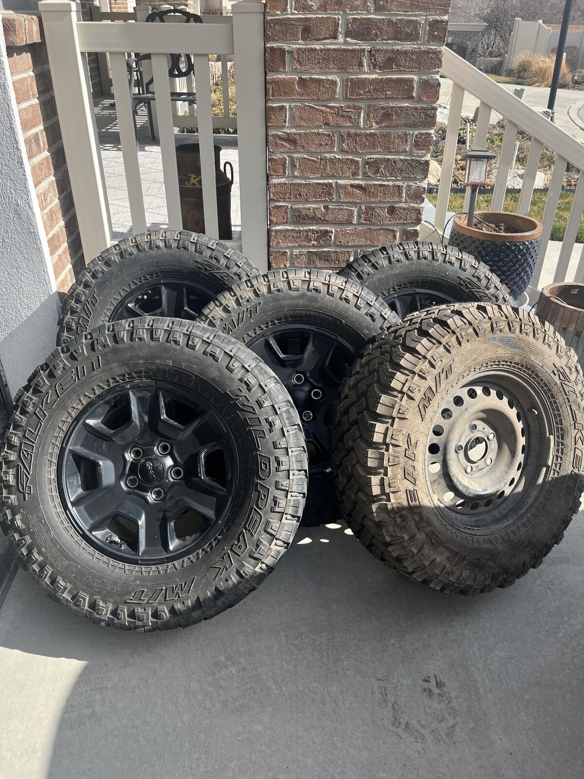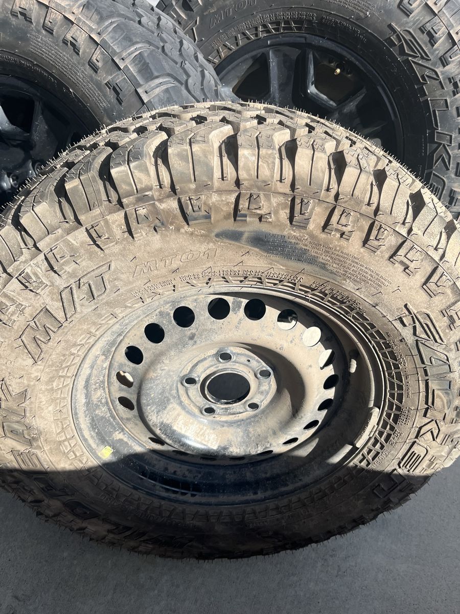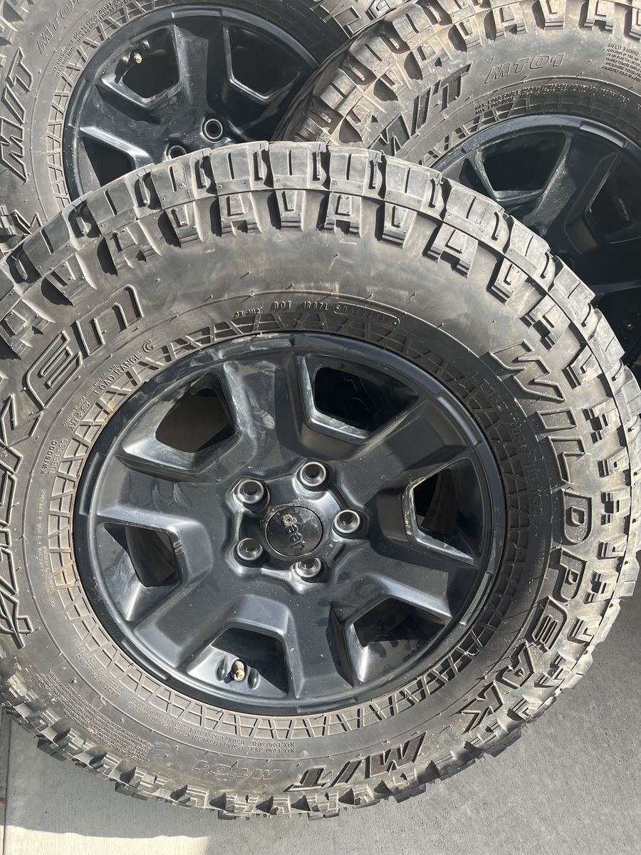 Zelle23 Jeep gladiator Mojave wheels and tires still has good tread on the tires. I haven't noticed any scratches on them. It is a set of five. The spare is brand new never been used, still has the knone on it. 5x5 I believe