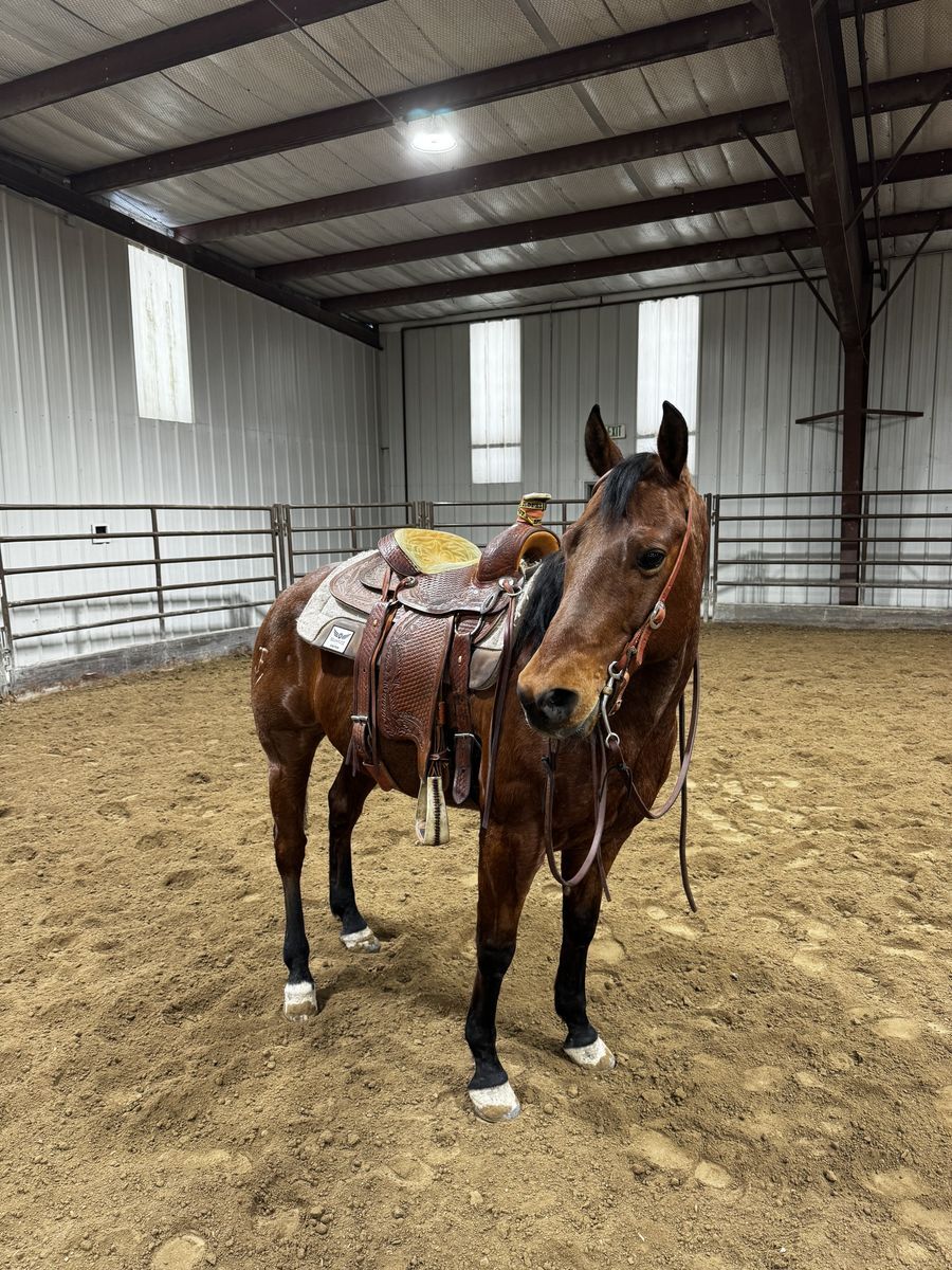 13 in March. No vices or physical issues. Has a good tempermant and does no spook. However he is a naturally fast paced horse needing an experienced rider. Can be roped off of and is ridden daily. 7,800 OBO