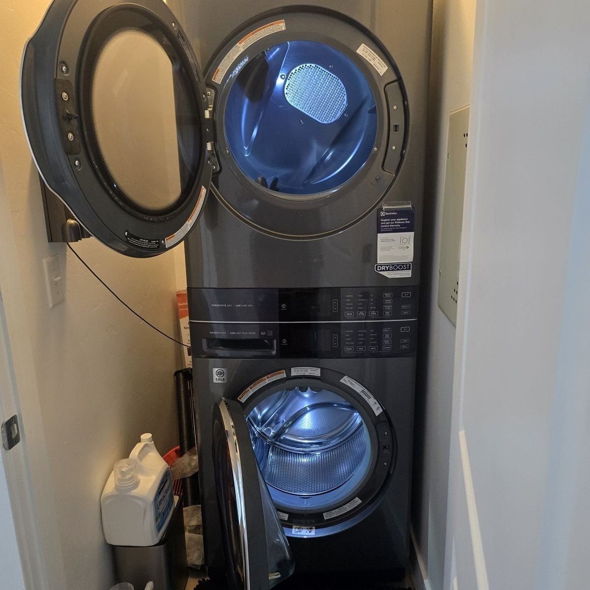 VenmoElectrolux stacked washer and dryer, electric hookup. 11 months old. I purchased this unit brand new at RC Willeys. it will come with the 5(4 years left) year warranty. ill just need a little info to transfer the warranty to your name. its practically brand new!