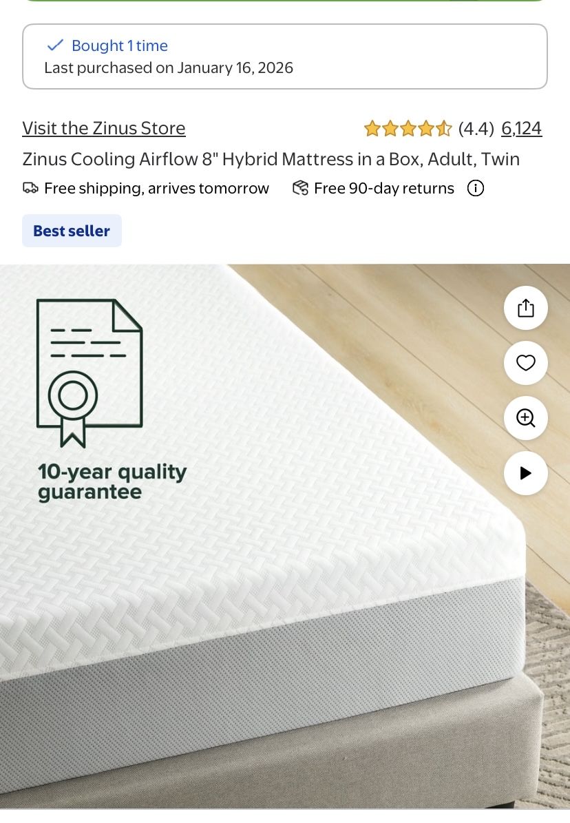 VenmoThis is a twin metal bed frame, this was purchased on January 16 2026 As well as the Zinus cooling airflow 8 inch Hybrid mattress. We bought this and then decided that my son needed a bigger bed so we purchased him a Queen. There is nothing wrong with this bed other than it will not grow with him.
