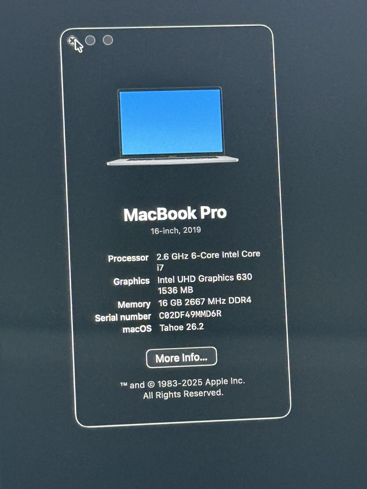 2.6GHz 6-core Intel Core i7 Intel UHD Graphics 630 16GB DDR4 RAM 1 TB SSD Serial Number: C02DF49MMD6R