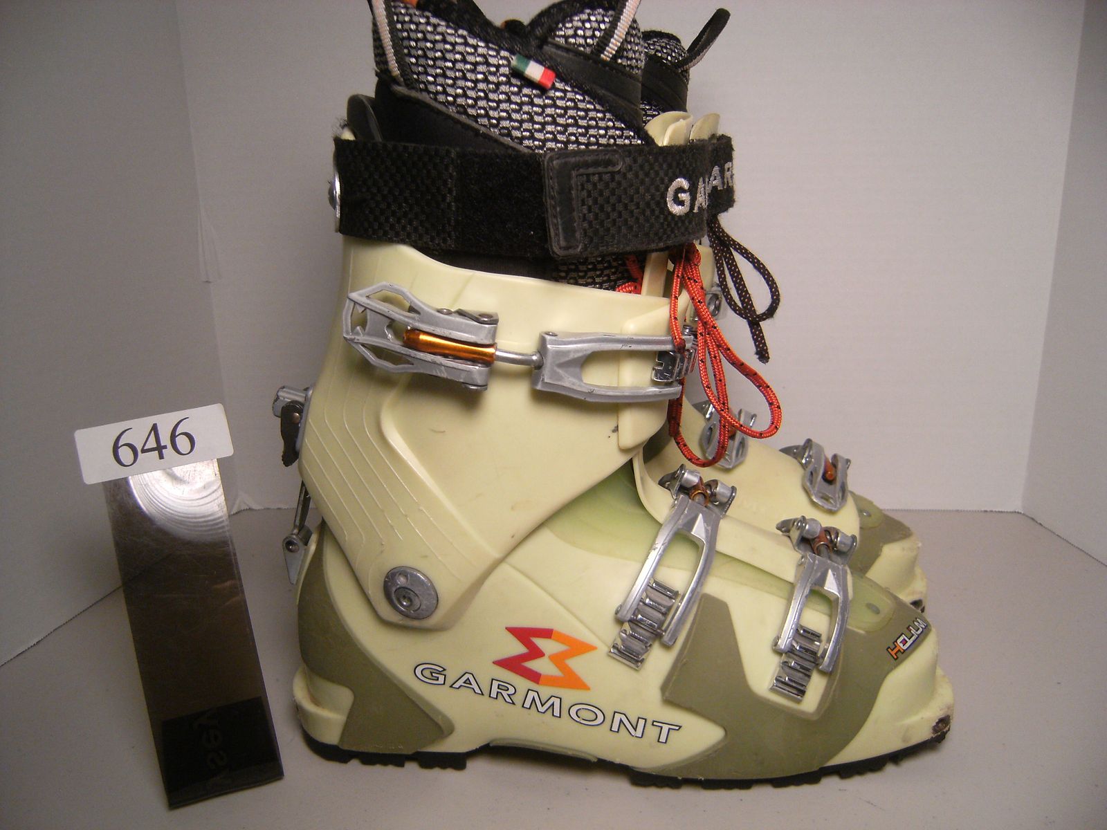 MONDO 27.5 MENS US SZ 9.5 GARMONT HELIUM ALPINE TOURING BOOTS, TECH INSERT TOES / CLEATED HEELS, YELLOW / GREEN 315 MM BSL GOOD CONDITION ITEM 646 $39