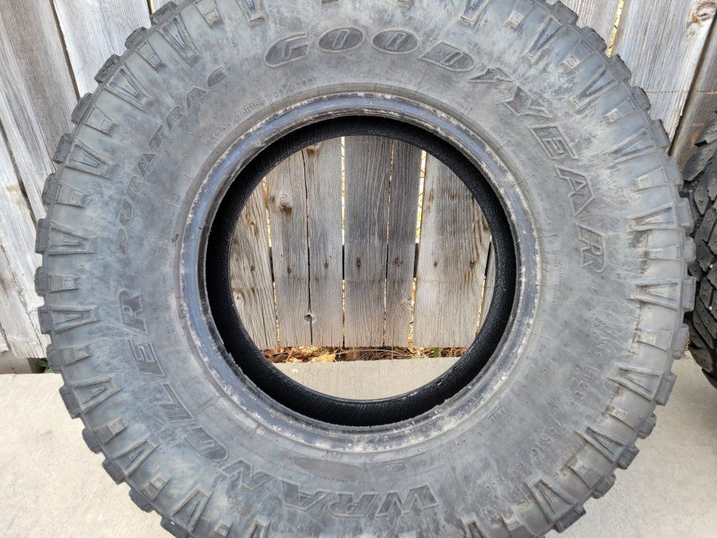 I have two 265/75R16 123/120Q load range E Goodyear Wrangler duratrac tires, still in good usable condition, just took them off my truck, $75 takes both.