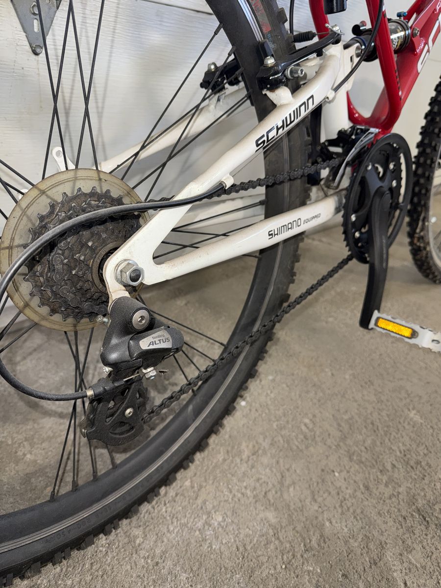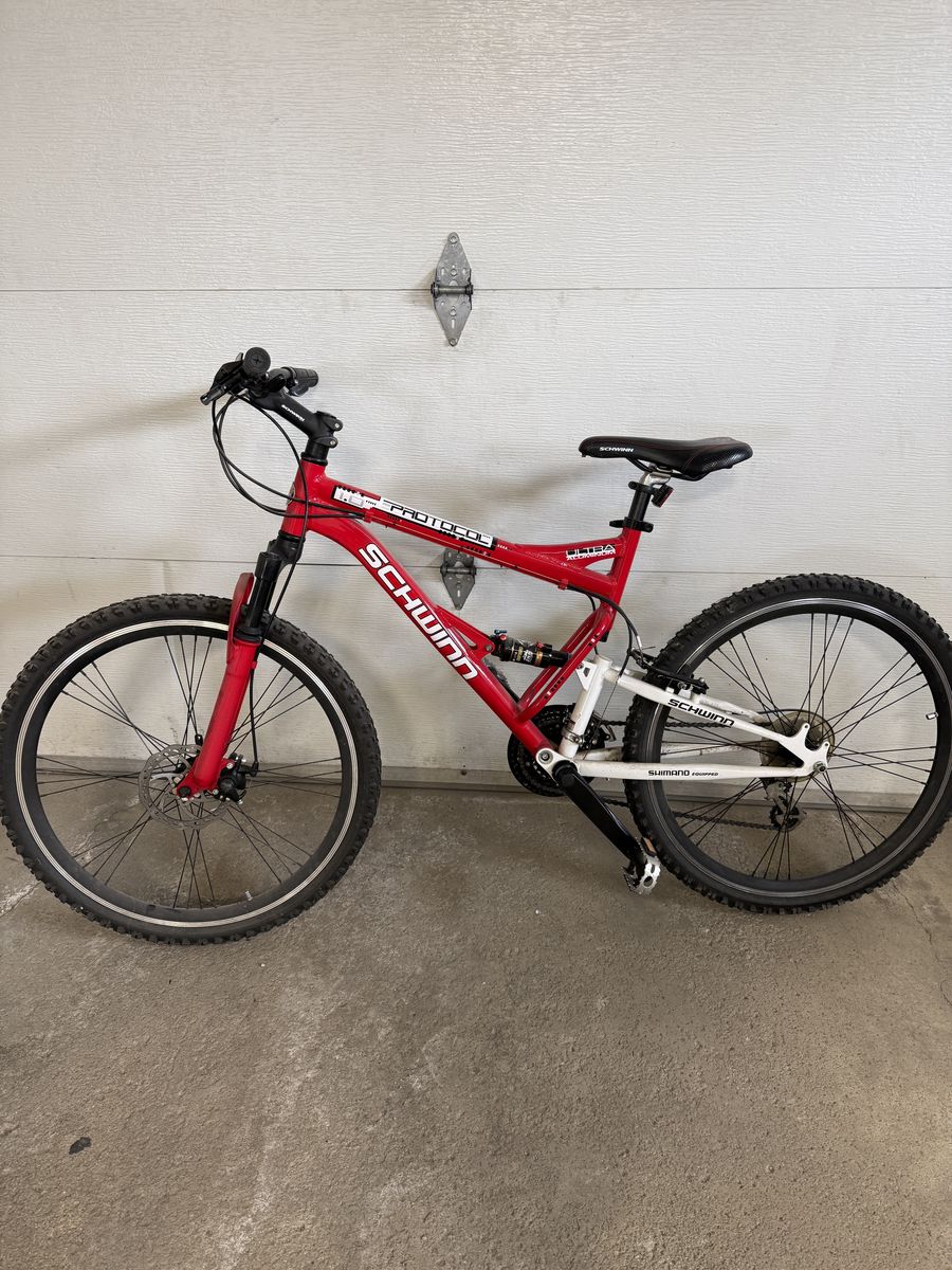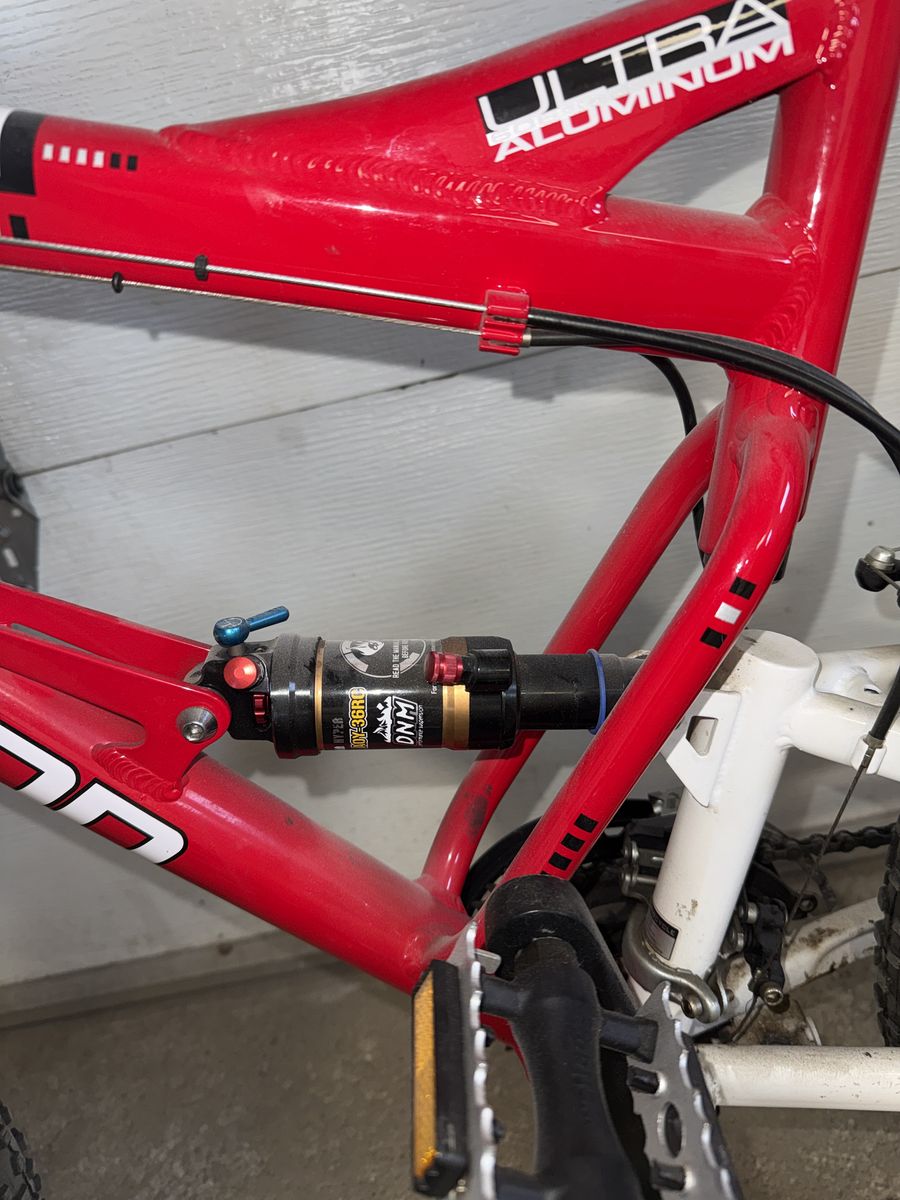 Venmo21-Speed shifter and lightweight aluminum frame, full suspension. Good tires and disc brakes. New DNM air shocks.