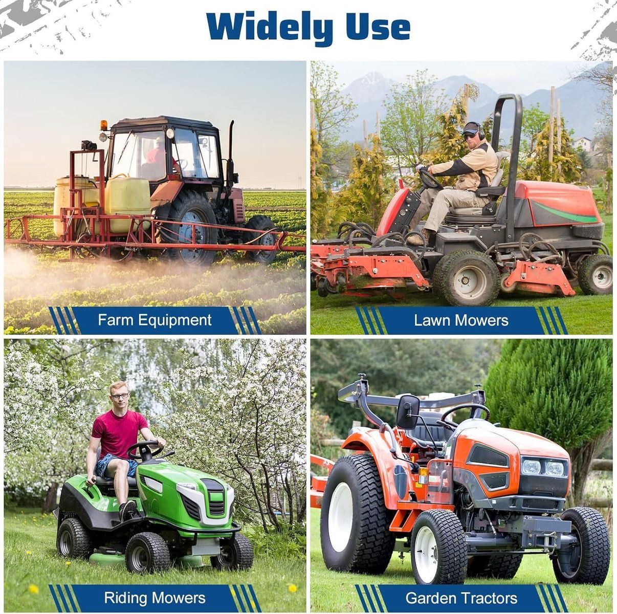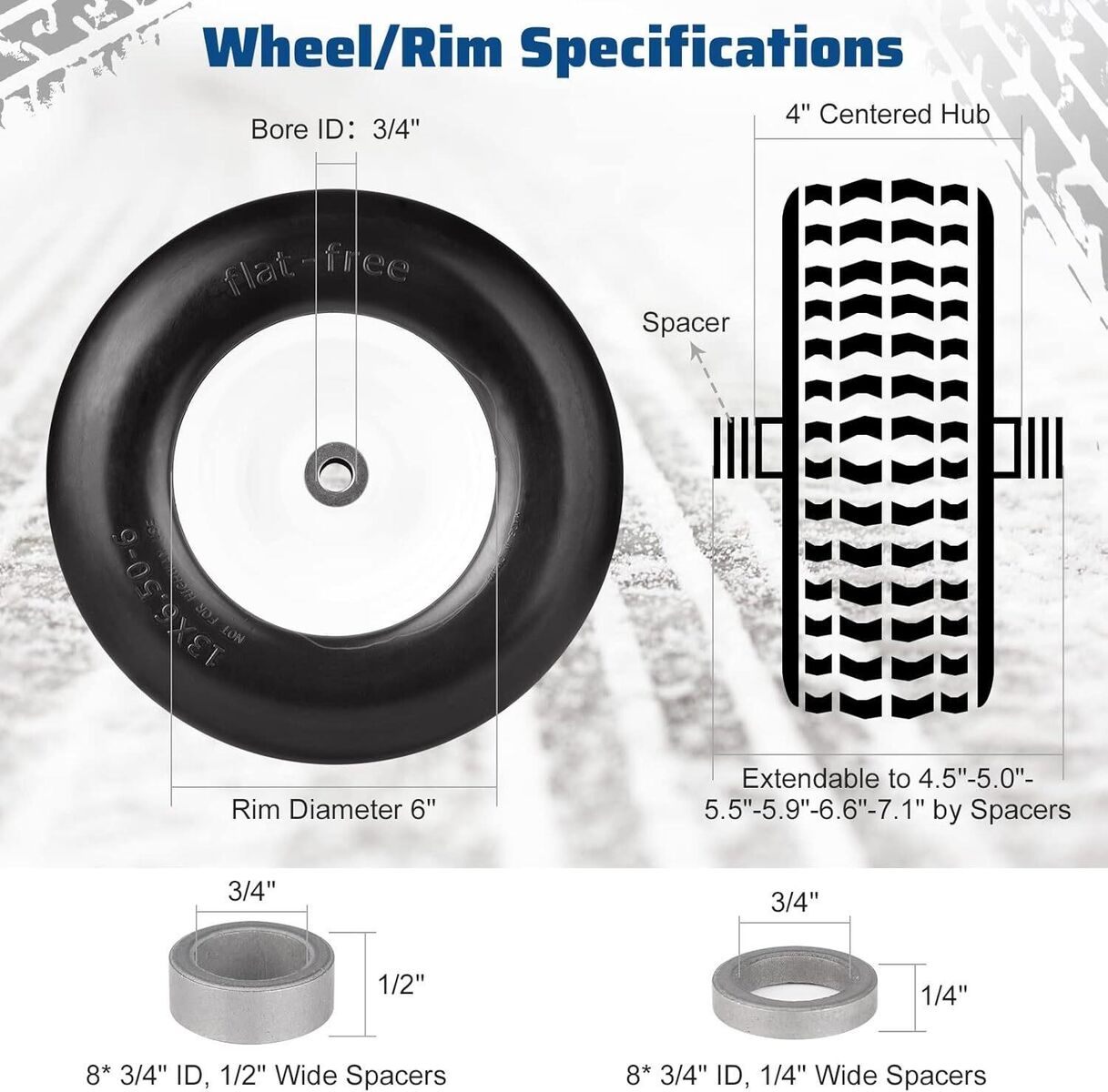 This flat free smooth tire w/steel wheel fits deck 38"-68" commercial lawn mower garden tractor. Tire diameter: 13"; Tire section width: 6.5"; Rim diameter: 6"; Hub length: 4"-7.1"; Bore ID : 3/4" (NOT For 1/2" or 5/8" Bore ID). Please select a suitable one according to your current request. Built to last, this maintenance-free tractor turf tire is puncture-resistant and made from high-quality materials. Its versatile design suits both home and commercial use, while the universal adapter kit ensures compatibility with various wheeled equipment. Each pack includes 2 tires, supporting a max load capacity of 450 lbs. Please note that this tire is designed for off-road and turf applications only and is not suitable for highway use.