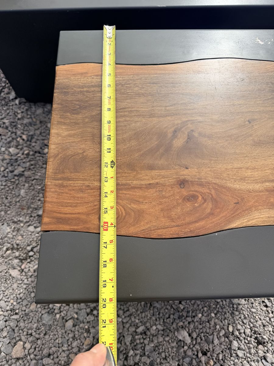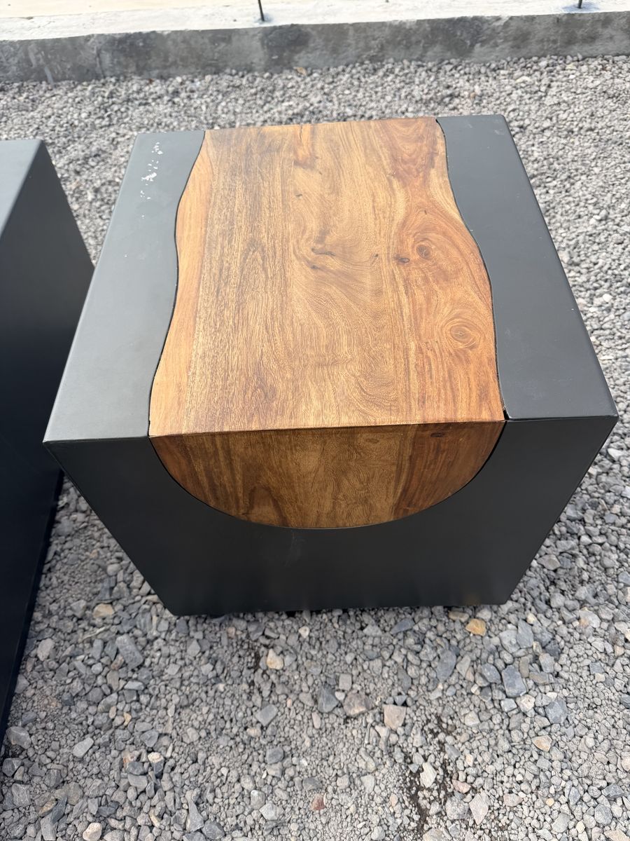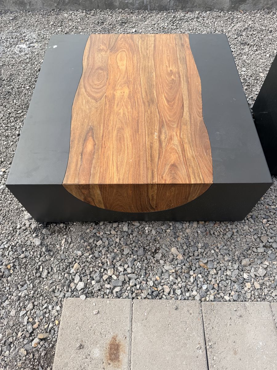 Acacius coffee table by Arhaus Hand crafted Steel frame, left out in the elements to age and oxidize Cross section of a reclaimed yuka tree fixed in the center Multi-toned finish with organic wood grain throughout Light finished, square base $580 for both (OBO)