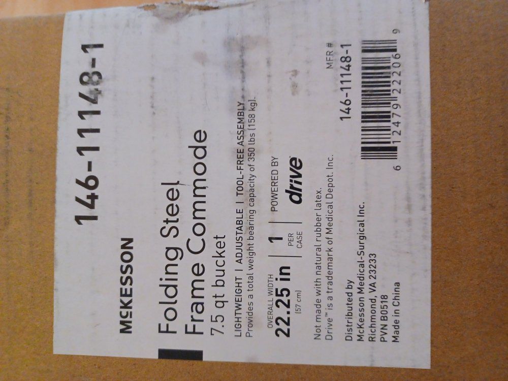 ZelleUnopened, never used, folding steel frame commode. 7.5 qt bucket, 350 pound weight capacity.