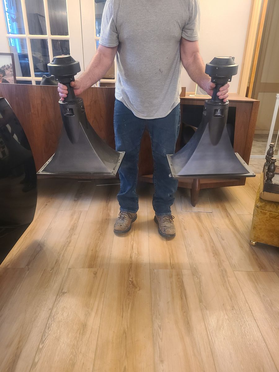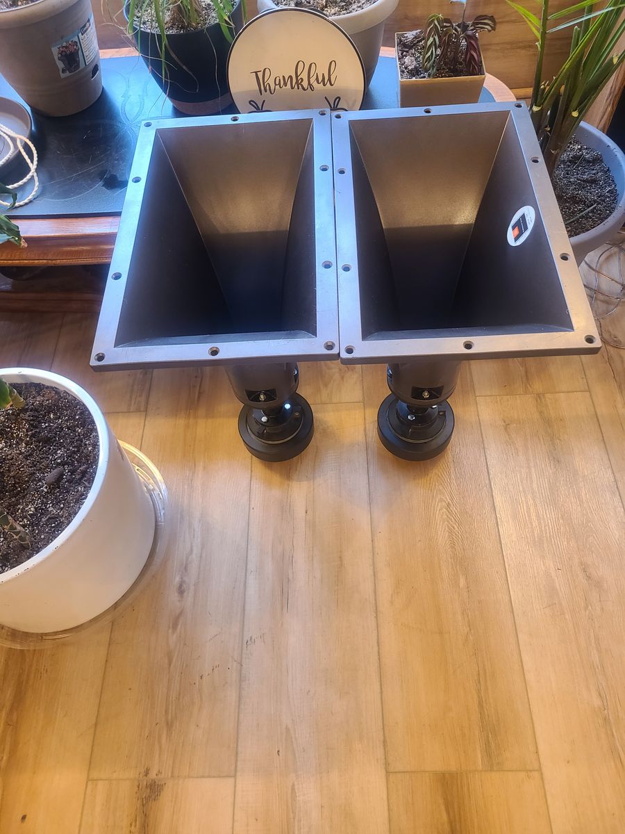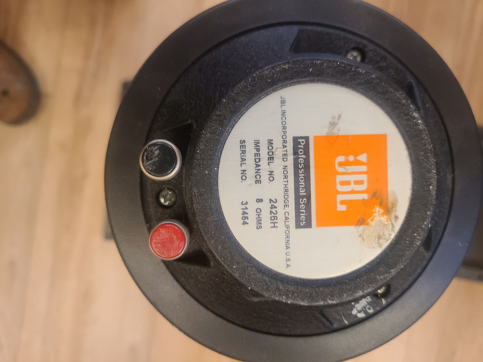Beautiful pair of JBL 2386 horns with JBL 2327 1" to 2" throat adapters with JBL 2426H drivers. Ideal for upper midrange. 70watts @ 800Hz, 100watts @ 1.2Khz and up. Both have beautiful ohm readings, one reads 3.3 ohm, the other 3.8 which is in the perfect range of an 8ohm HF driver