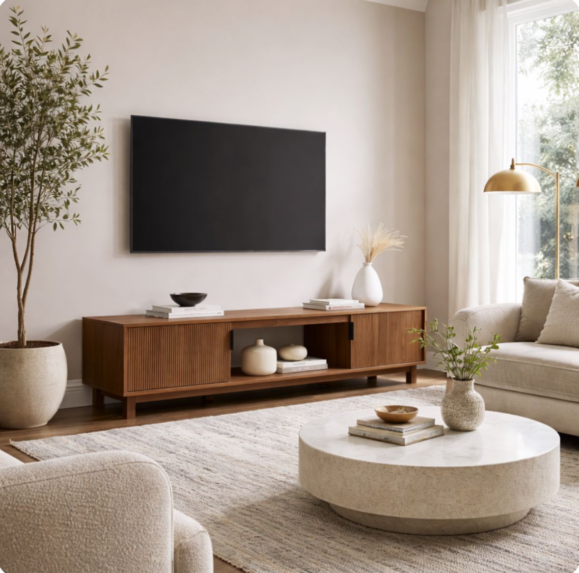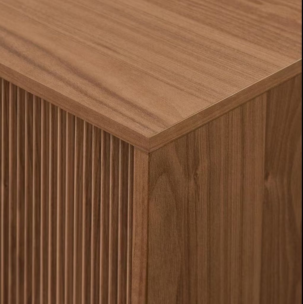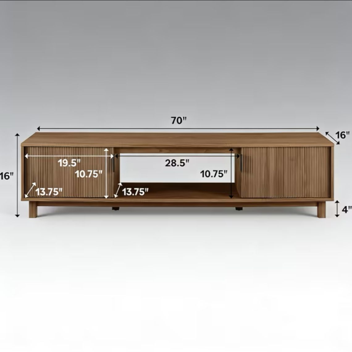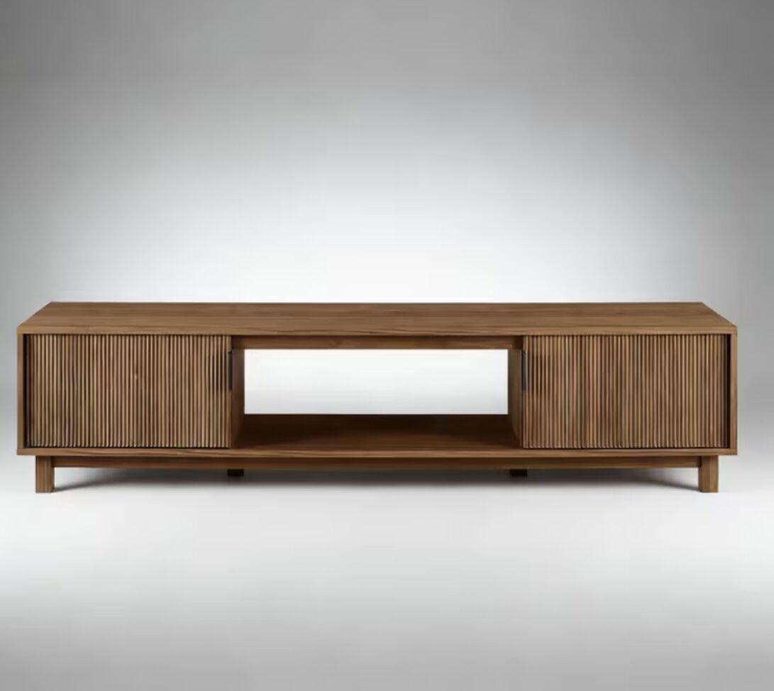 Stylish mid-century modern wood veneer media console/TV Stand. Has cool ribbed sliding doors. Open shelf in the middle for your stuff. Nice warm tone walnut wood veneer. Measures 70 inches wide, 16 inches high, and 16 inches deep.