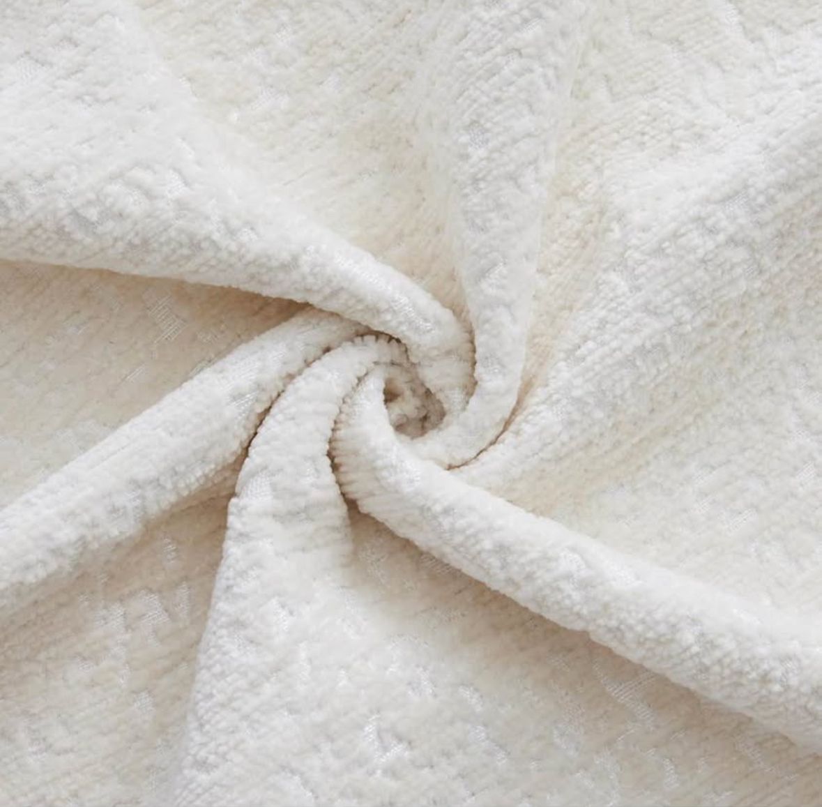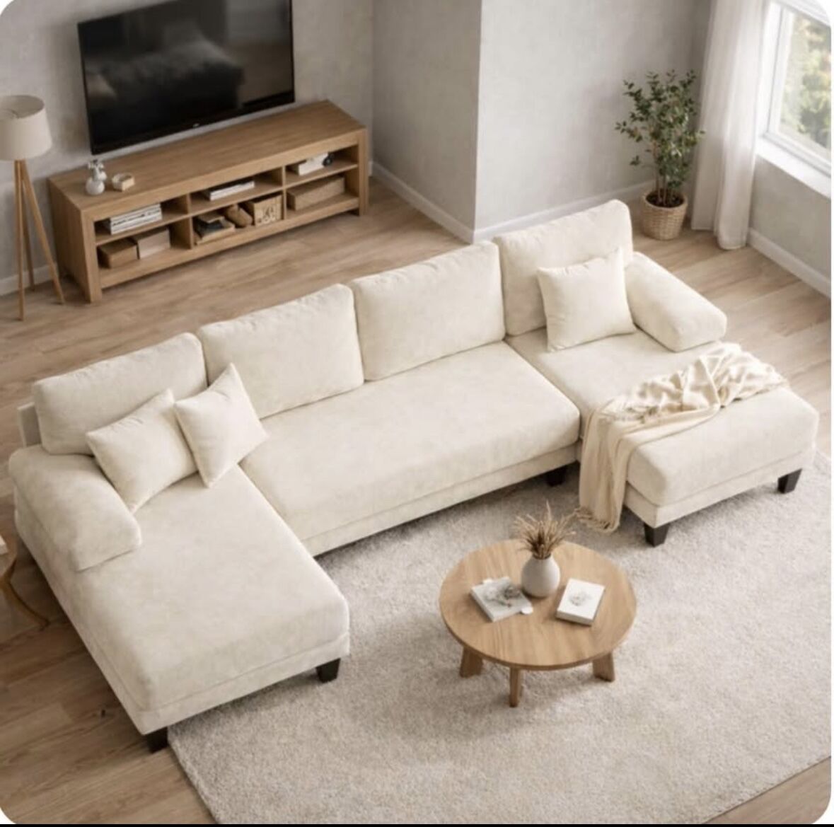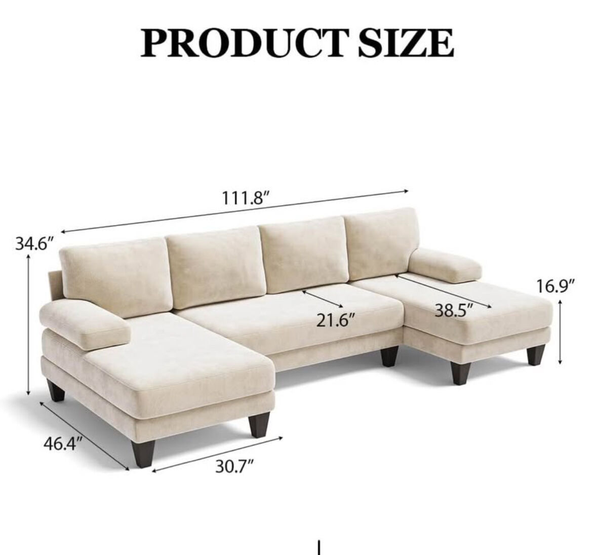 Spacious cream u-shaped sectional sofa. Big U-shaped couch with two chaises, one on each side. Super soft velour/chenille fabric Super comfy for movie nights or just chilling. Overall length 111.8 inches. Overall height 34.6 inches. Left & Right chaise depth 46.4 inches. Seat height 16.9 inches. Great for a living room, loft, apartment, basement, theater room, etc.