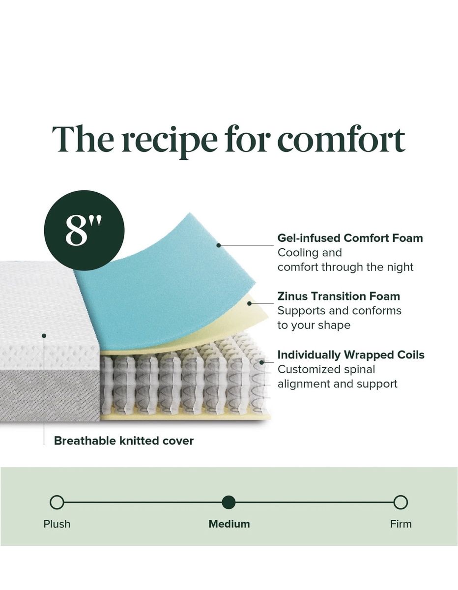 Zinus 8 Cooling Airflow Hybrid Mattress in a Box, Adult, Queen Individually wrapped coils provide personalized support and conform to your body's unique shape, promoting proper spinal alignment and pressure relief for better comfort A top layer of ultra-breathable Airflow memory foam conforms to your body shape, relieving pressure points and improving circulation for better comfort Made with high-quality CertiPUR-US certified foam and wrapped in an OEKO-TEX certified cover, this mattress is free of harmful chemicals for healthier sleep This mattress ships in a smaller box expertly engineered for a smaller carbon footprint