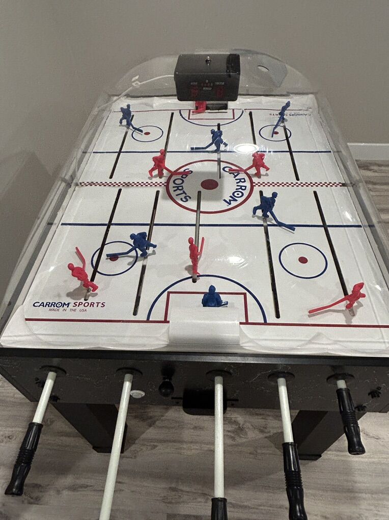 ZelleCarrom Bubble Hockey Table. Rare. In immaculate condition. Scoreboard works. No bends in the bars to move the players.
