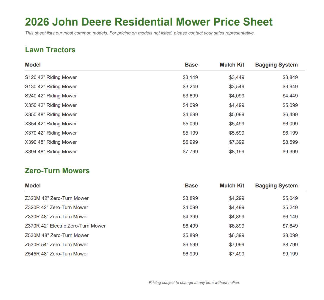 Every mower is professionally set up by John Deere certified technicians—fluids topped off, deck leveled, controls adjusted, blades torqued, tires set, fueled, and any bagger or mulch kit you purchase installed before delivery—so it arrives truly ready to mow. You’re also backed by the John Deere brand’s reputation for parts availability and easy serviceability, plus the Stotz dealer network for genuine parts, expert service, and long‑term support.