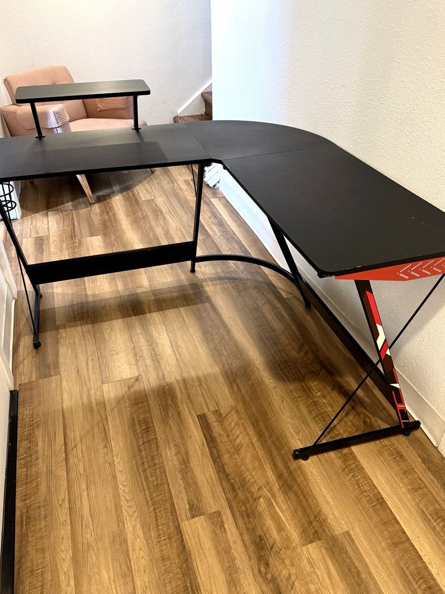 Excellent condition L-shaped gaming/computer desk with monitor riser shelf. Super sturdy and perfect for gaming setups, work-from-home, or dual monitors.