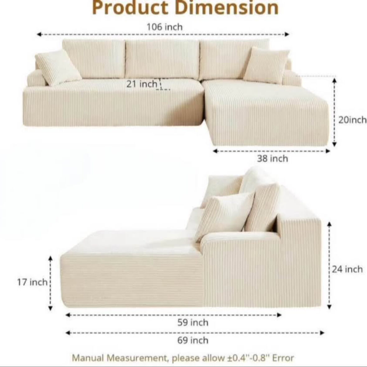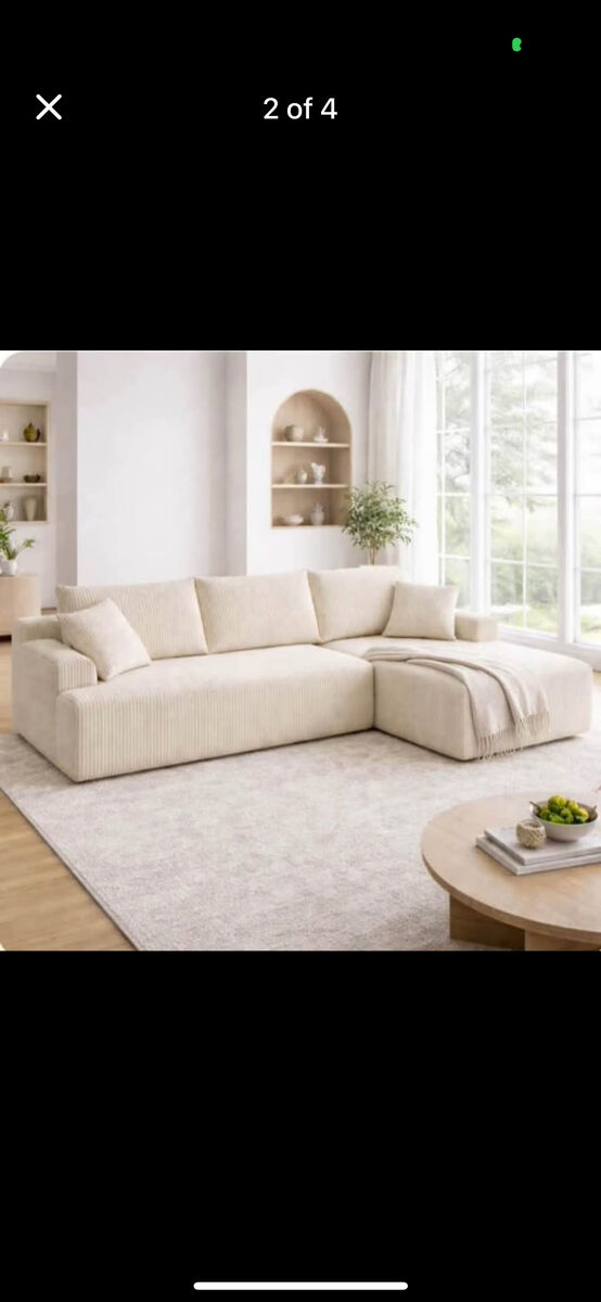 NEW IN BOX! 105” Cream Colored Sectional Cloud Sofa w/ left side L Chaise. Comfortable sectional sofa with chaise lounge with throw pillows. Three large back cushions. Soft Corduroy Textured velvet fabric. Great for living room or family room.