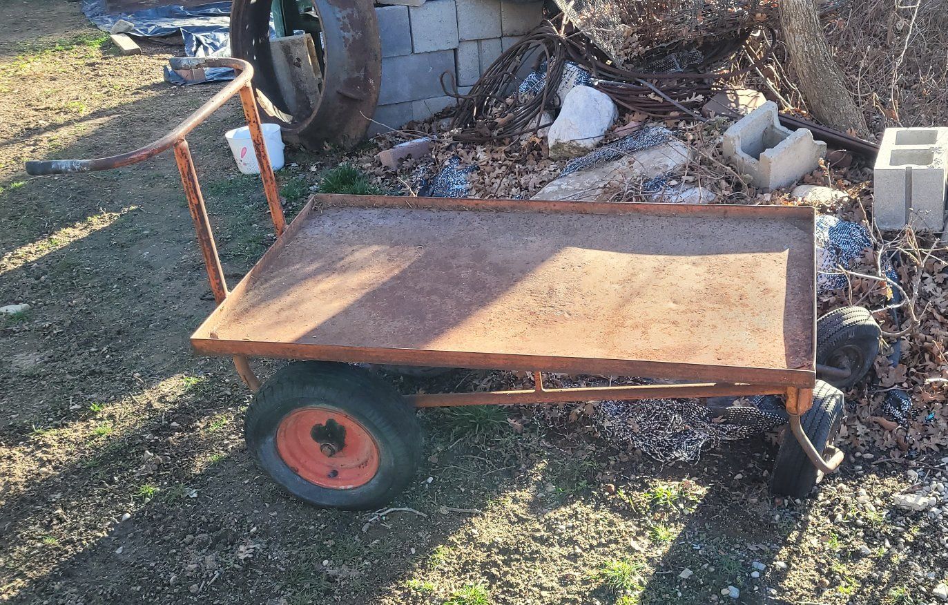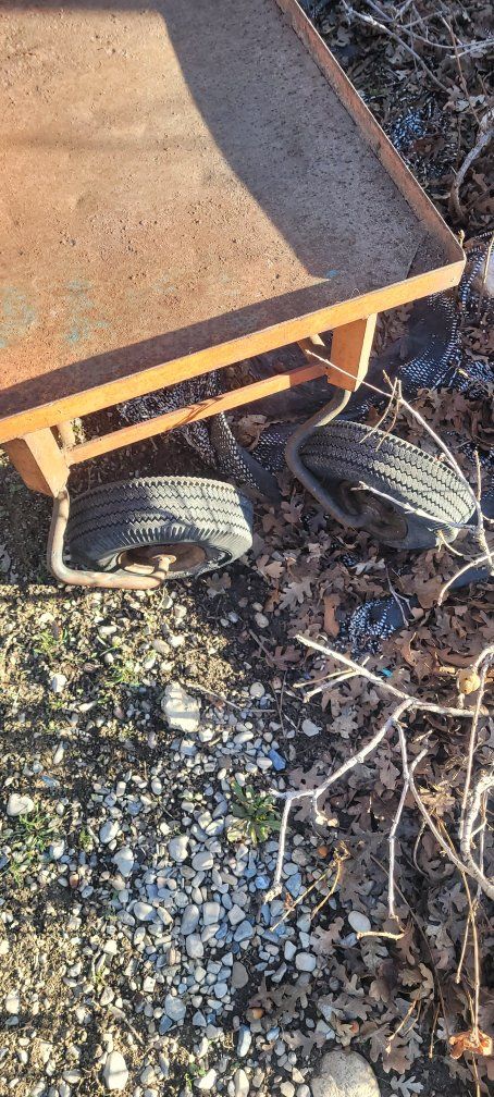 heavy duty steel platform two straight tires at the handles two swivel at other end. the two smaller need to be replaced