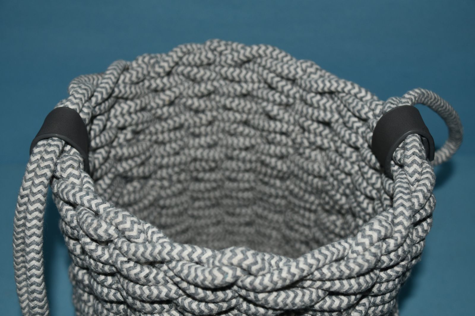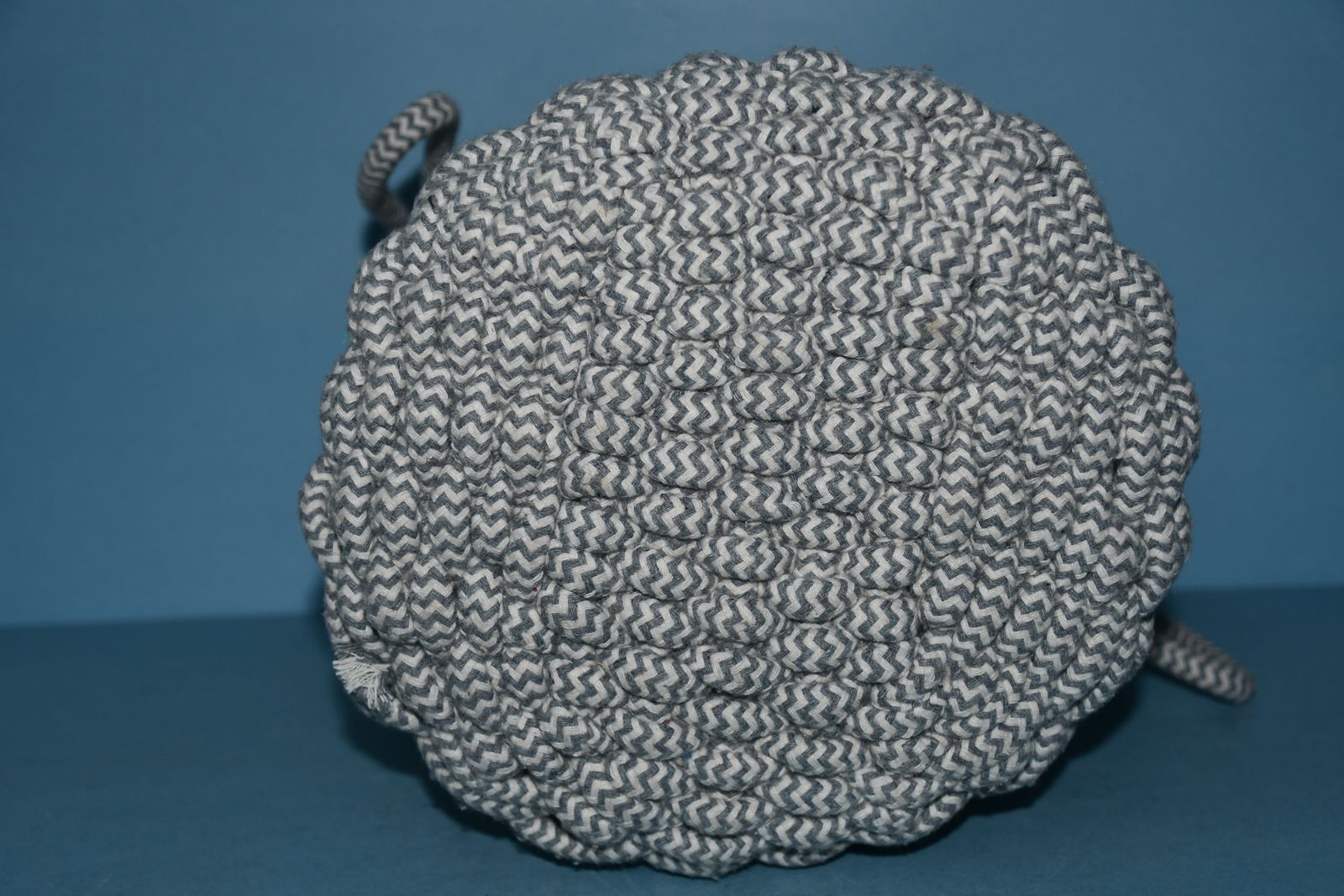 This GRAY & WHITE ROPE BASKET with HANDLES is from a smoke free home. It is about 9" in height with a diameter of about 8". It is CLEAN! Questions ??? Please ask. We are located in Plain City. Cash only please.