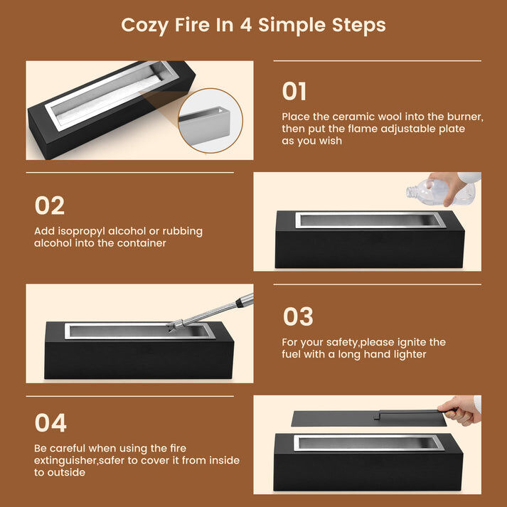 Modern, Safe & User-Friendly Design : With a sleek, contemporary aesthetic, this compact tabletop fireplace enhances both indoor and outdoor spaces. Measuring 15.7” (L) x 3.9” (W) x 3.8” (H) and weighing only 7 lbs, it’s easy to handle and operate. Designed with safety in mind, it ensures a seamless and stress-free experience.