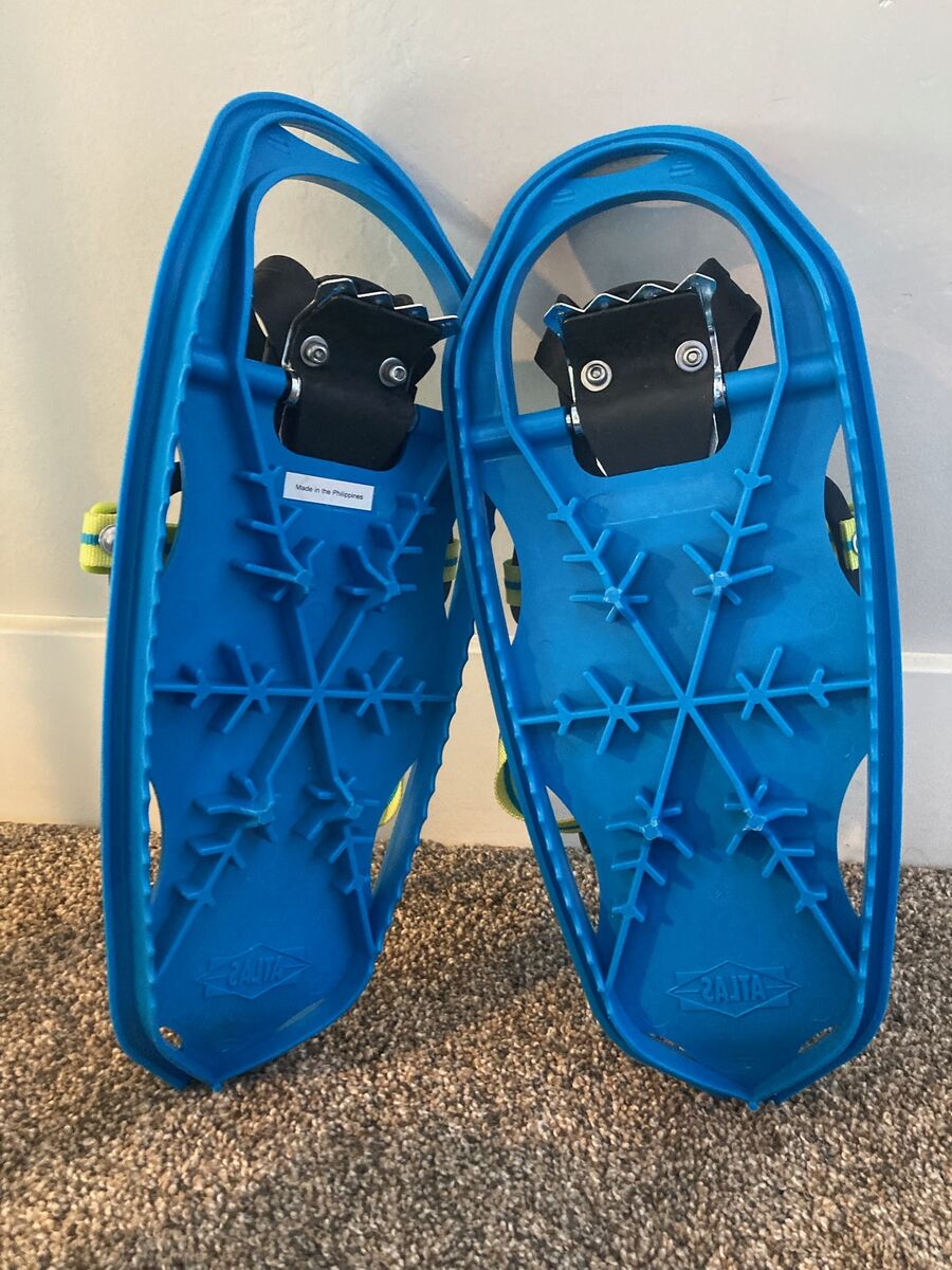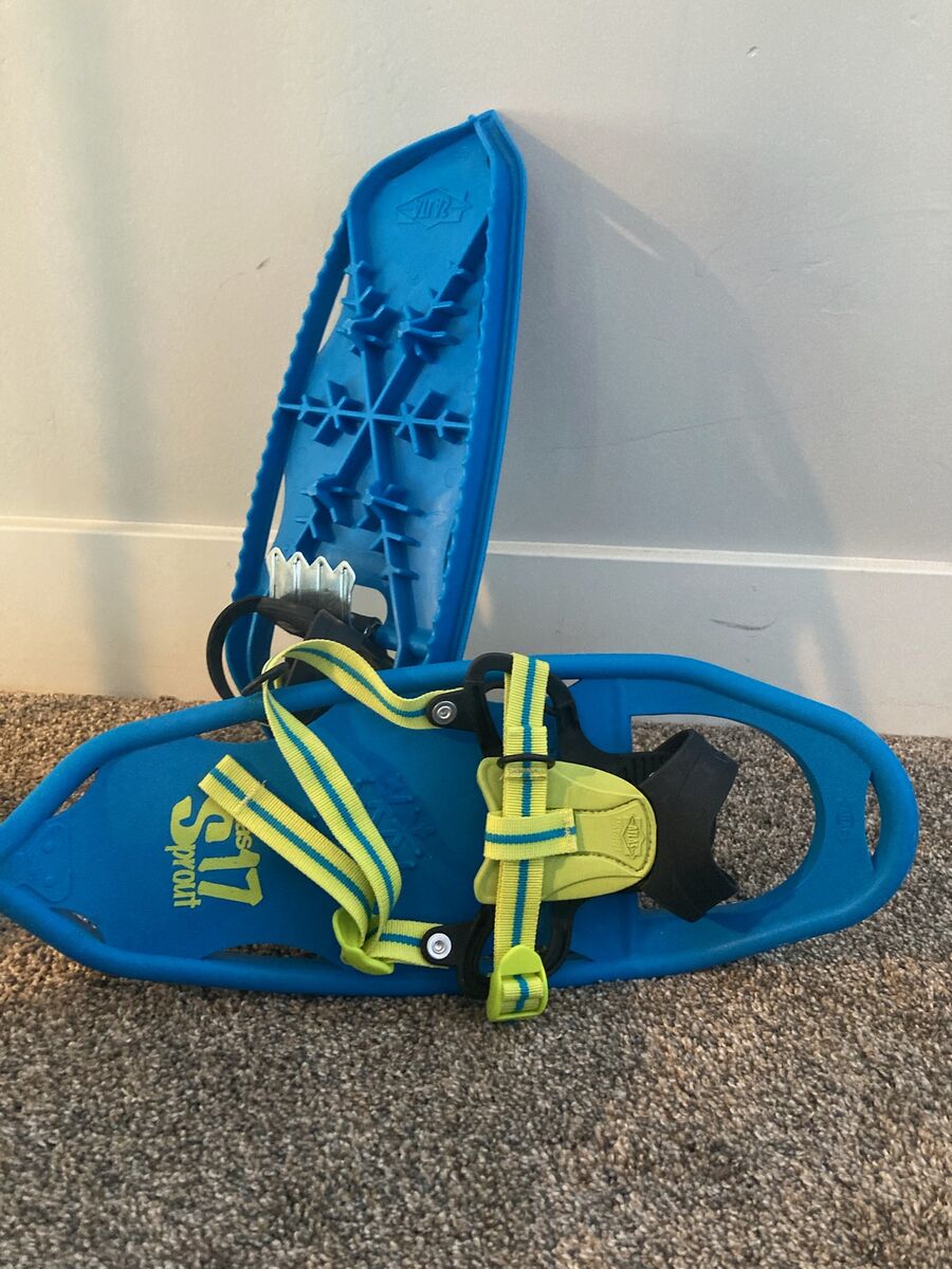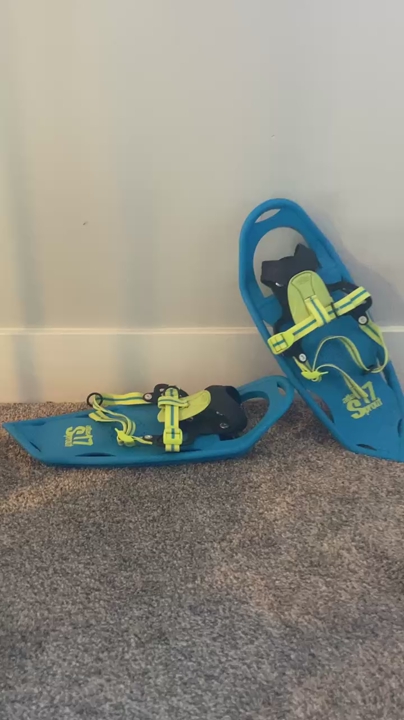 VenmoAwesome Atlas S17 Sprout snowshoes. Blue and yellow colors. Has adjustable straps for a secure fit. Great for kids or smaller adults to explore in the snow.