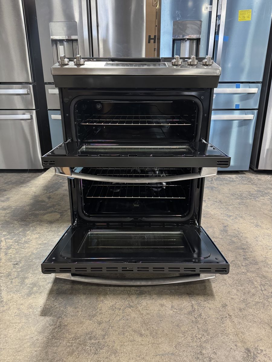 GE 30 Inch Slide-In Double Oven Gas Range with 5 Sealed Burners, 6.7 Total Oven Capacity, Continuous Cast Iron Grate, Integrated Griddle, Steam Clean, and ADA Compliant