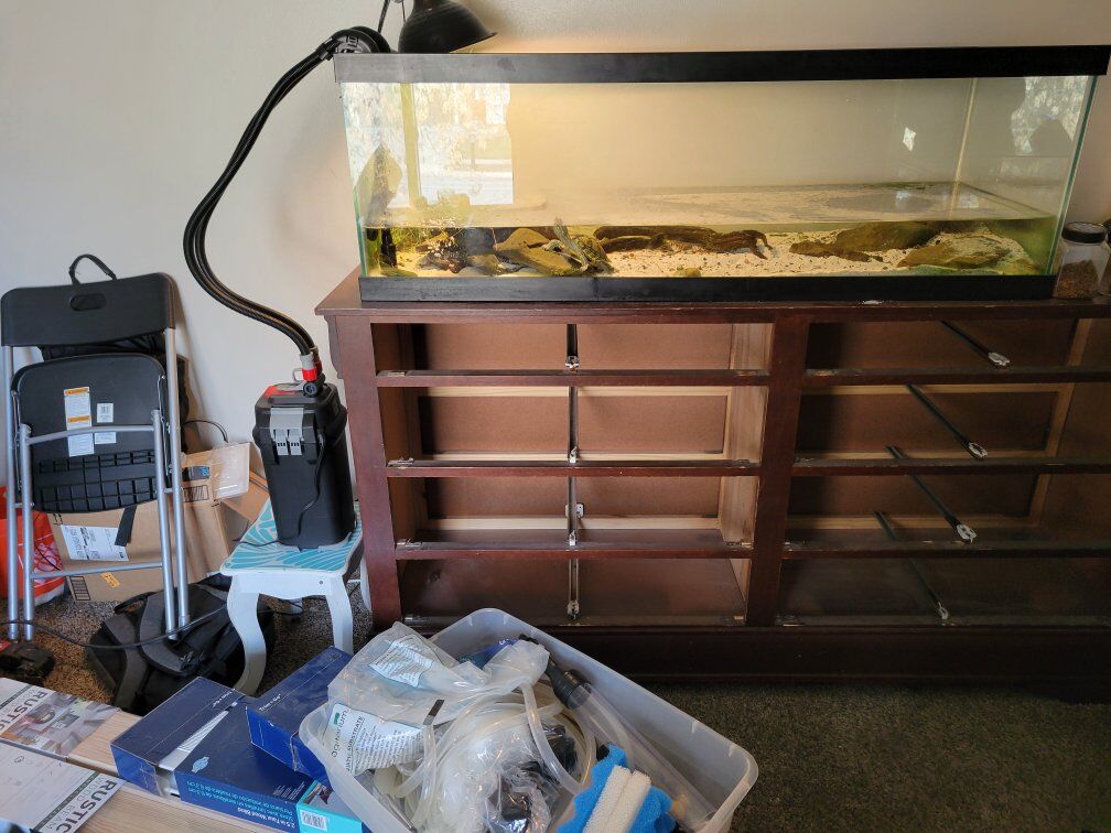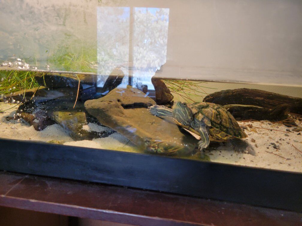 red eared slider water turtle, 180.00 obo. Comes with everything you see in the photos. Filter, light, cleaning tube, food and the 60 gallon tank.