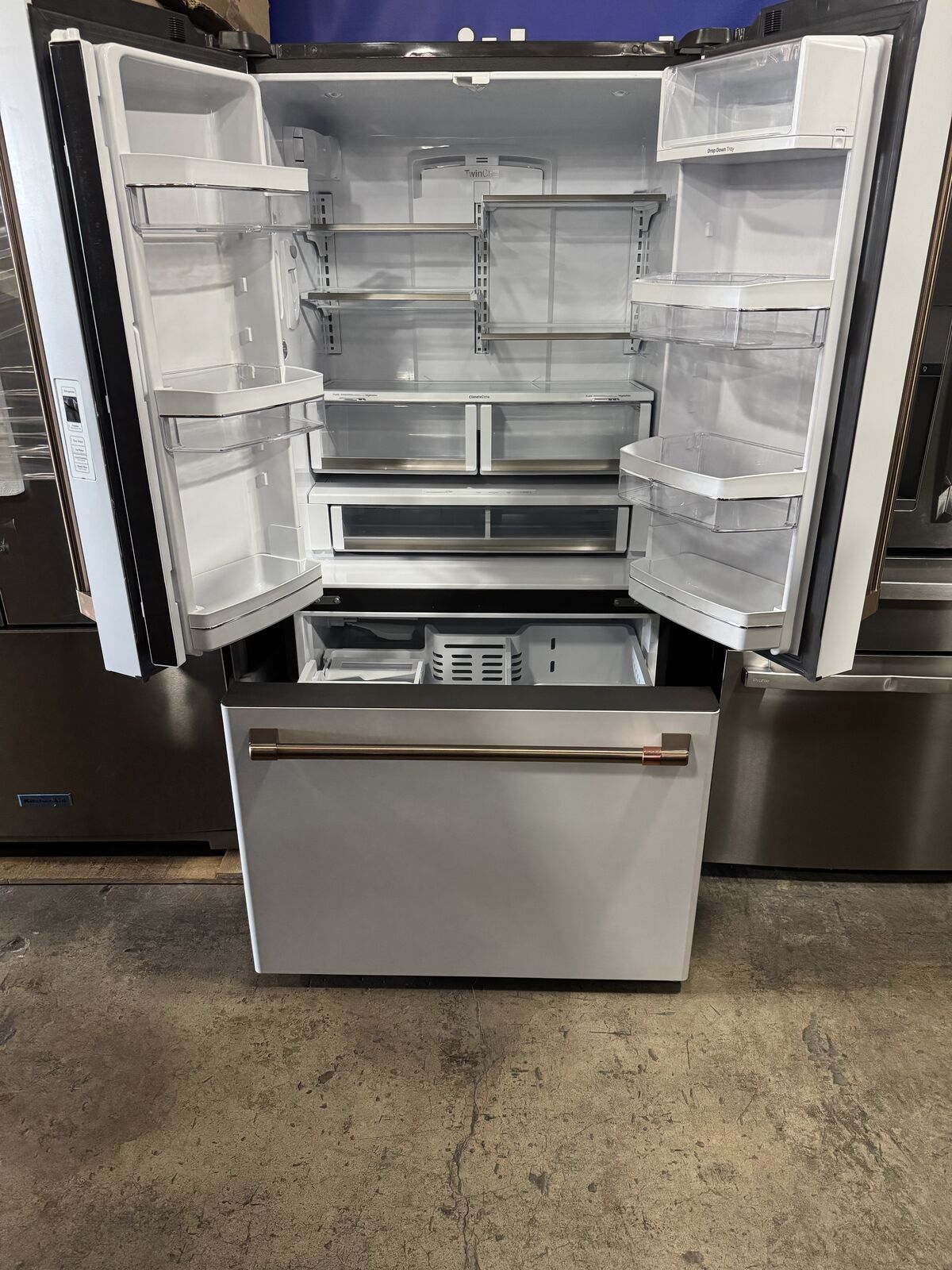 GE CAFE 36 Inch Counter Depth French Door Smart Refrigerator with 23.1 Cu. Ft. Capacity, TwinChill™ Evaporators, Temperature-Controlled Drawer, Wi-Fi, Internal Water\Ice Dispenser, and ENERGY STAR®: Matte White with Brushed Bronze Handles