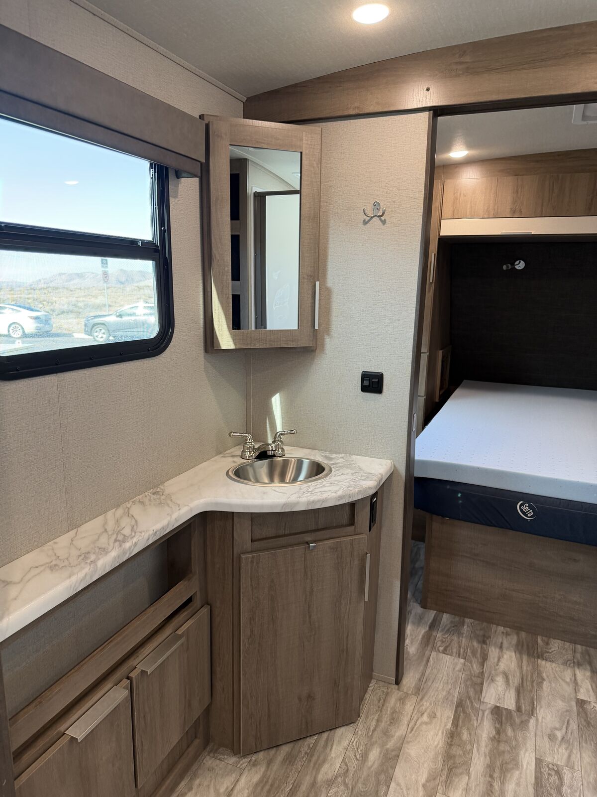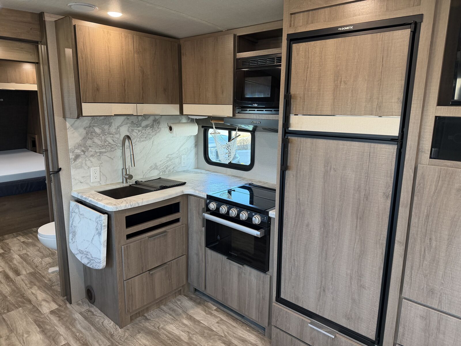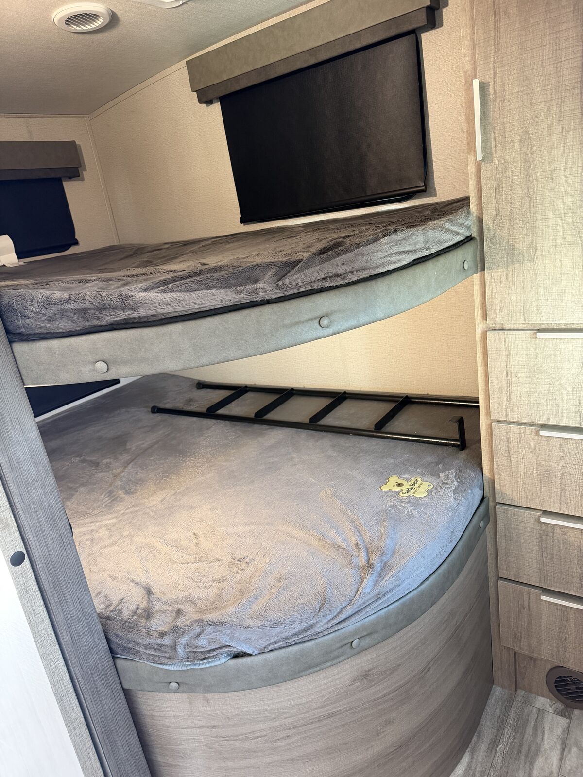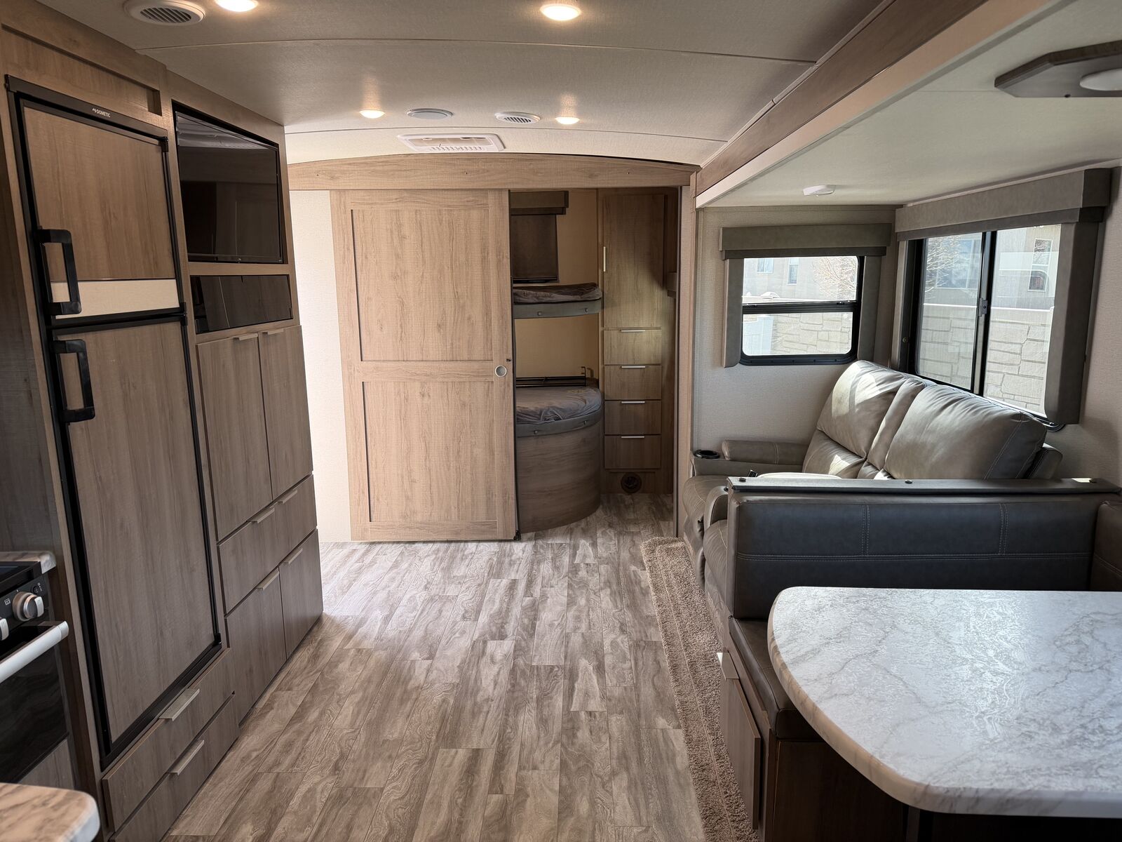The Imagine 2910BH boasts a spacious interior layout that includes a master bedroom, bunk beds, a full kitchen, and a bathroom. The living area features comfortable seating, a large dinette, recliners, and plenty of storage space for all your camping gear. The kitchen is equipped with high-quality appliances, a large sink, and ample counter space for preparing meals.