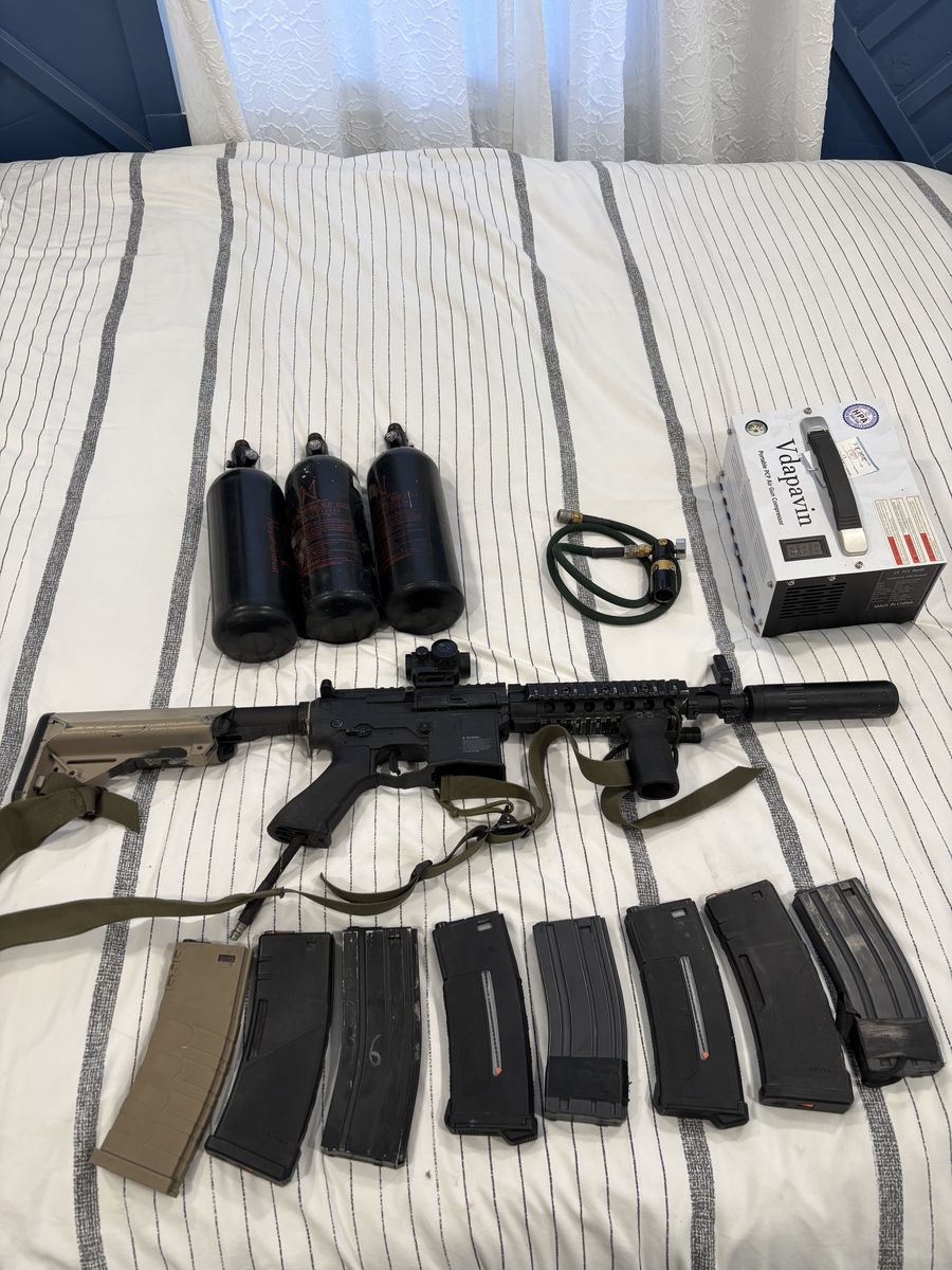 VenmoHpa m4 polar star jack Everything in picture is included and anything else I have for the gun M4 itself with attachments 3 62cu tanks 1 polarstar mini regulator 8 mid cap mags Electric air compressor to refill your own tanks 7.4v hpa Lipo battery If I get full the full price I will throw in a mini tracer unit too The gun is a mix of different m4 parts I’m not sure anymore what all of them are but it works good if you don’t like the gun you can pull the unit out and drop it into any gun you want.