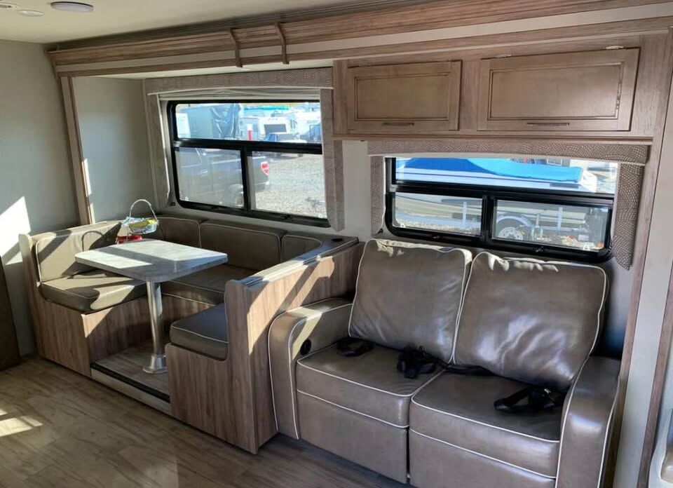 Convertible Comfort: A spacious U-shaped dinette and (optional/available) theater seating offer the perfect spot for movie night on the large LED TV.