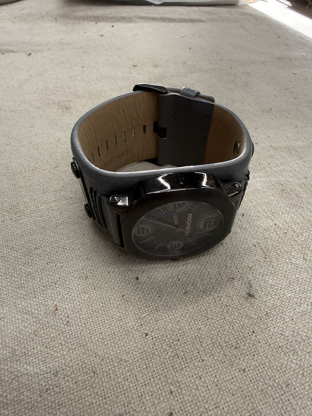 Details: Brand: Rockwell Large round face with unique number markers Black metal case Wide gray genuine leather cuff strap Adjustable buckle closure Quartz movement