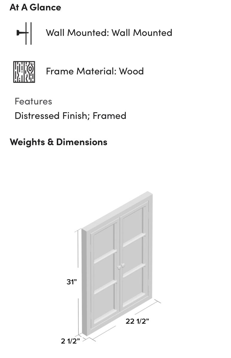 Summary SKU: W004997868 Anything but ordinary, this wall mirror is sure to grab glances whether it's welcoming guests in the entryway or bouncing natural light around the living room. Striking a rectangular silhouette, this design's wood frame features a two-tone finish and window-pane-style doors that open up to reveal the full mirror, while distressed details add a dash of modern farmhouse flair. Plus, it's easy to hang, so you can style your space in a snap.