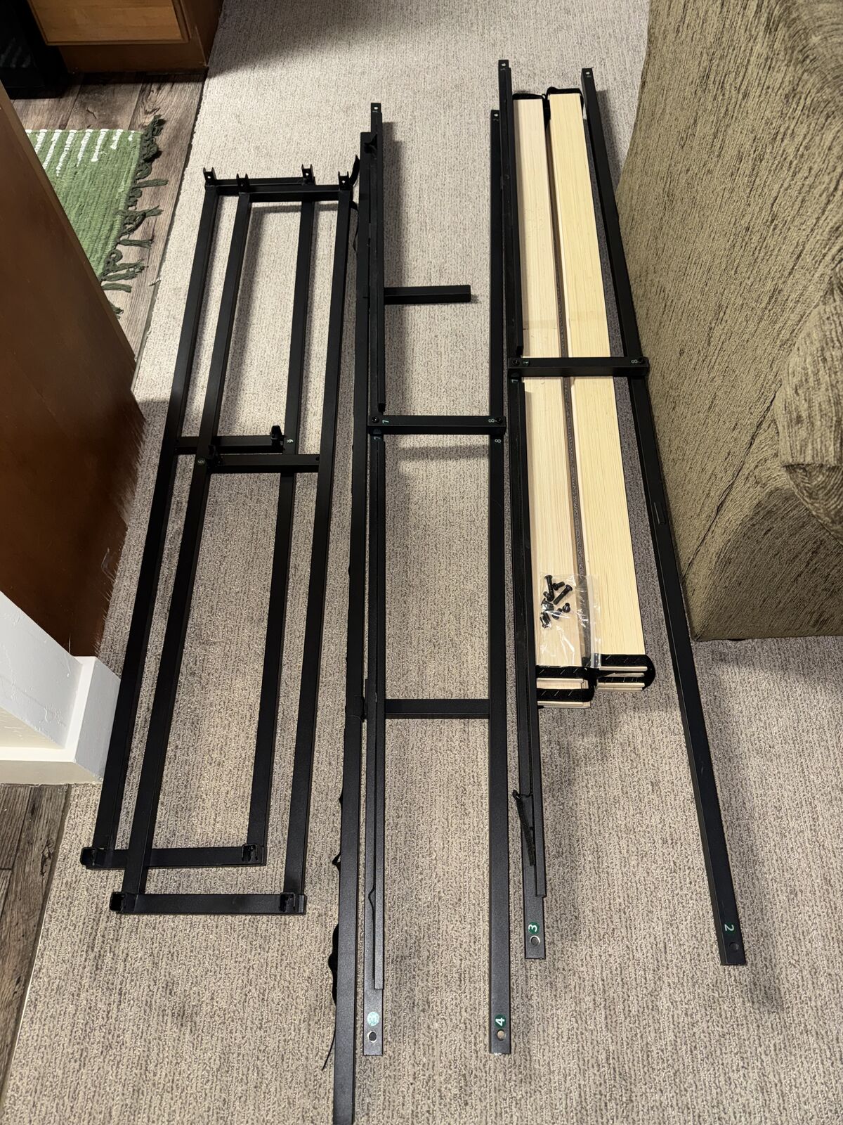 Frame is currently taken apart but is very easy to put together. It's made of metal and is also great for under-bed storage.