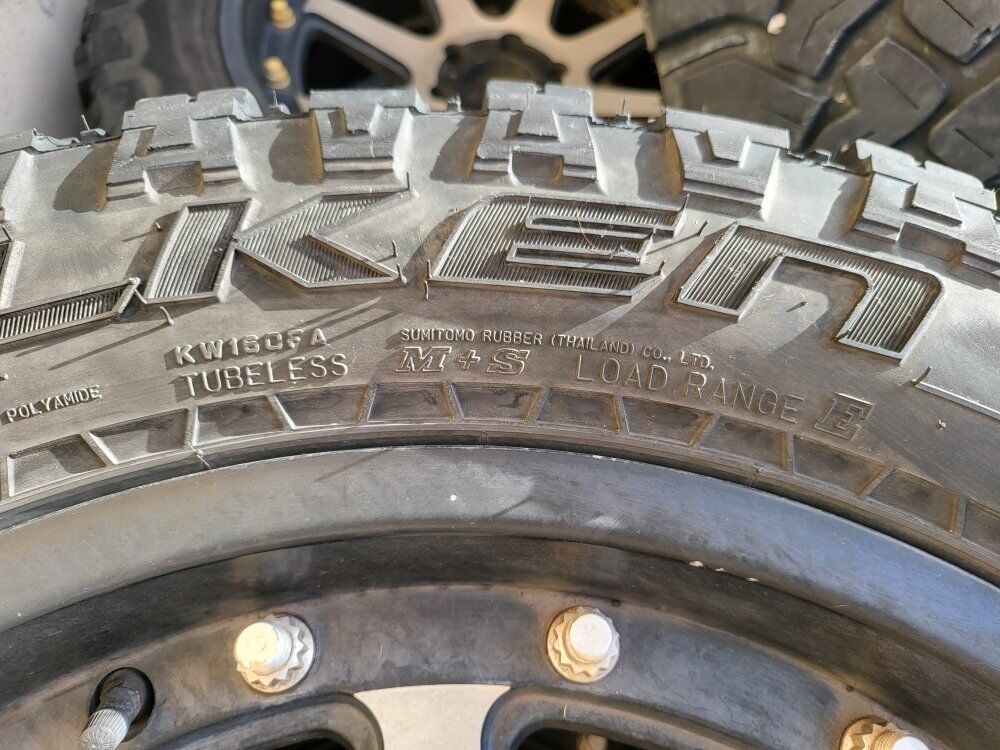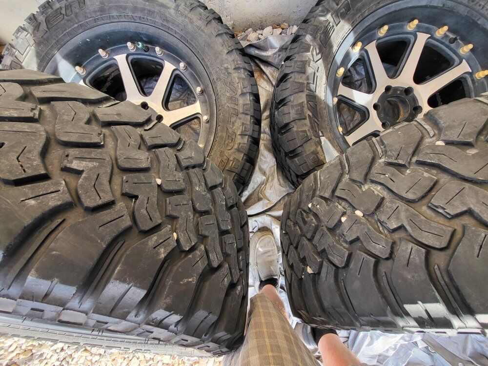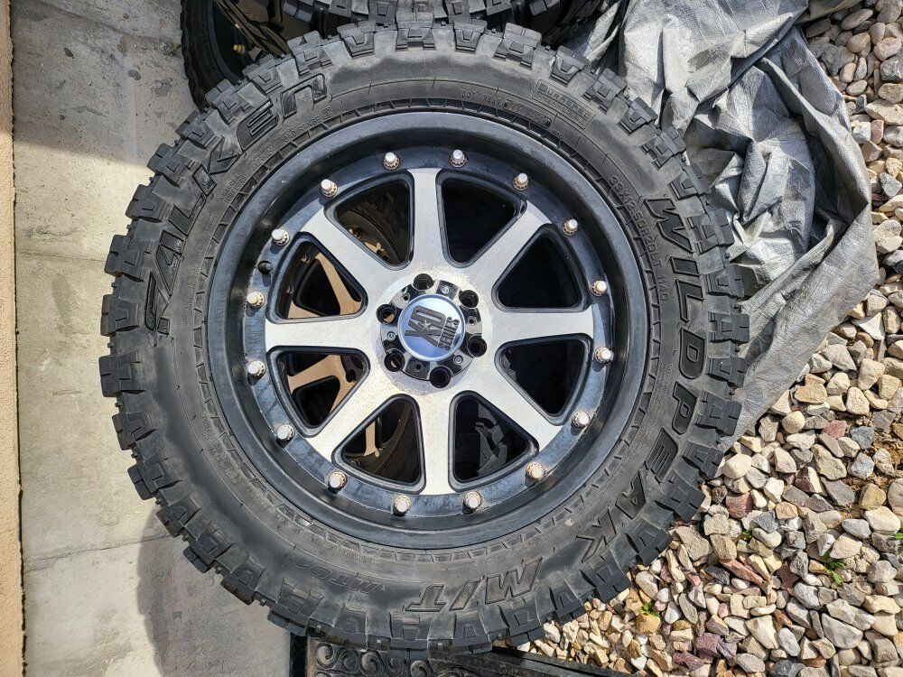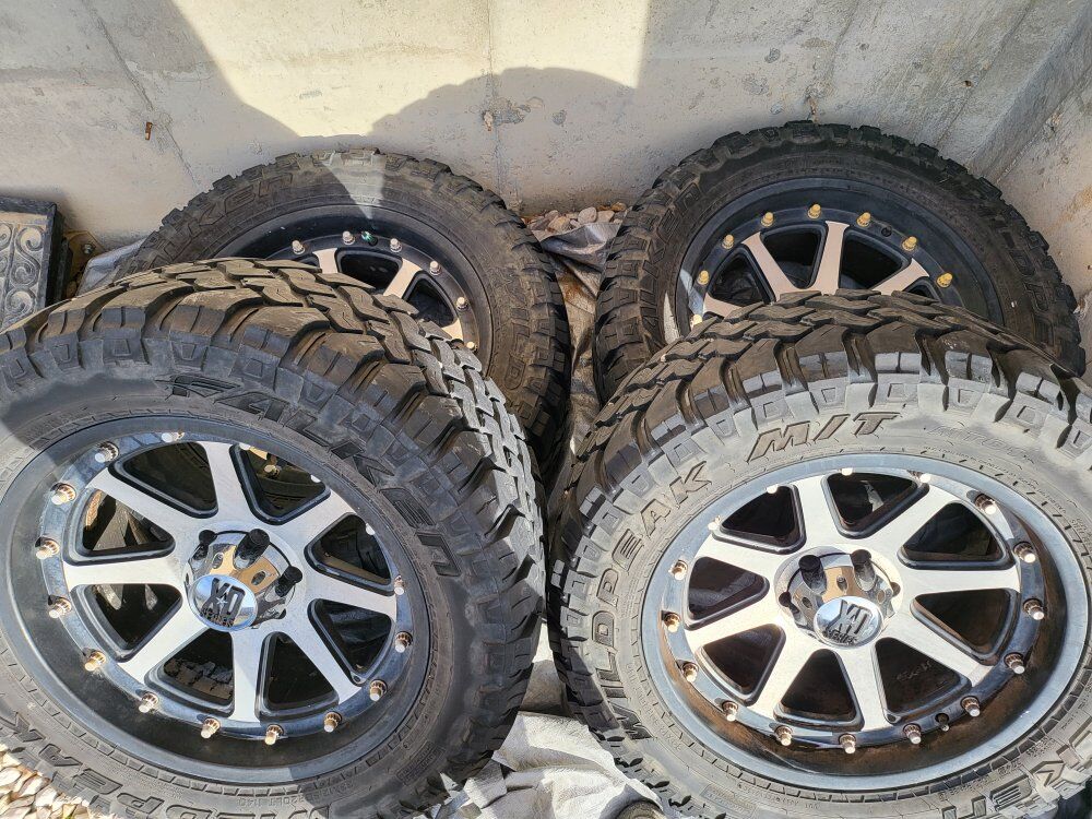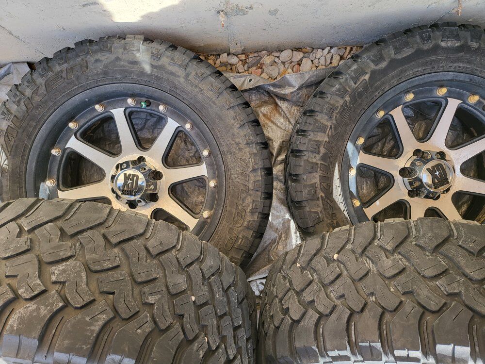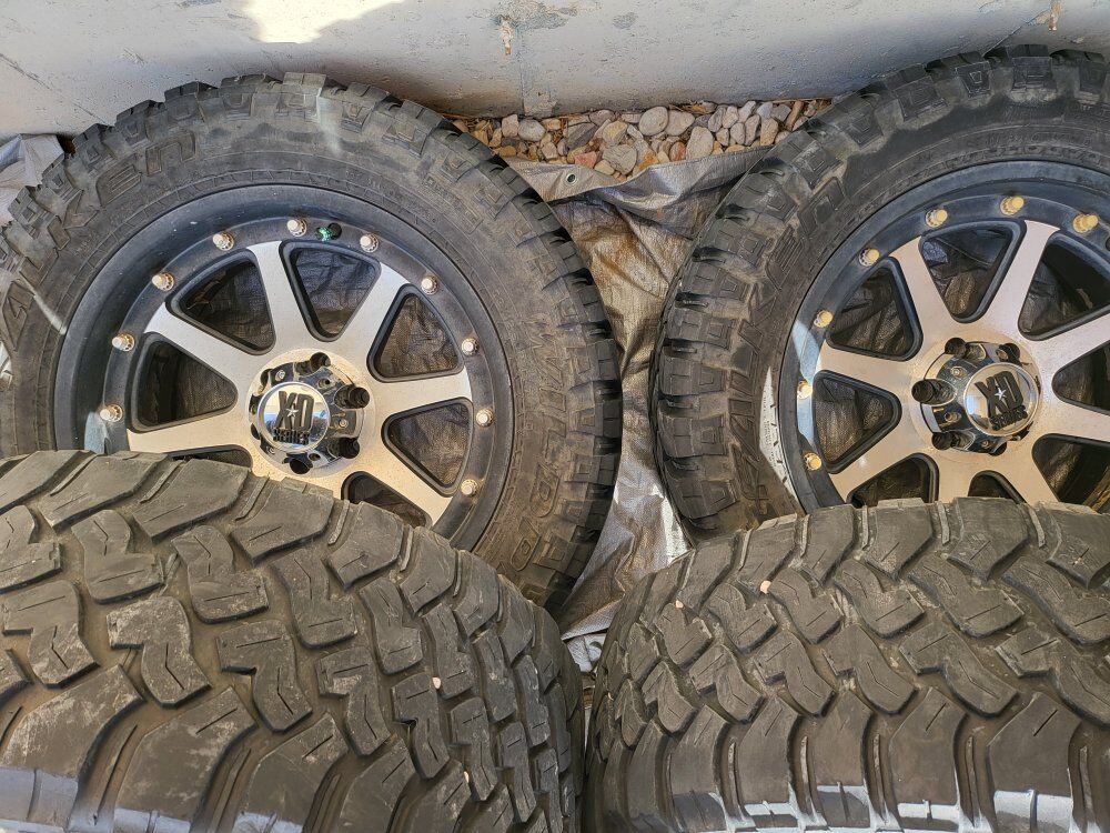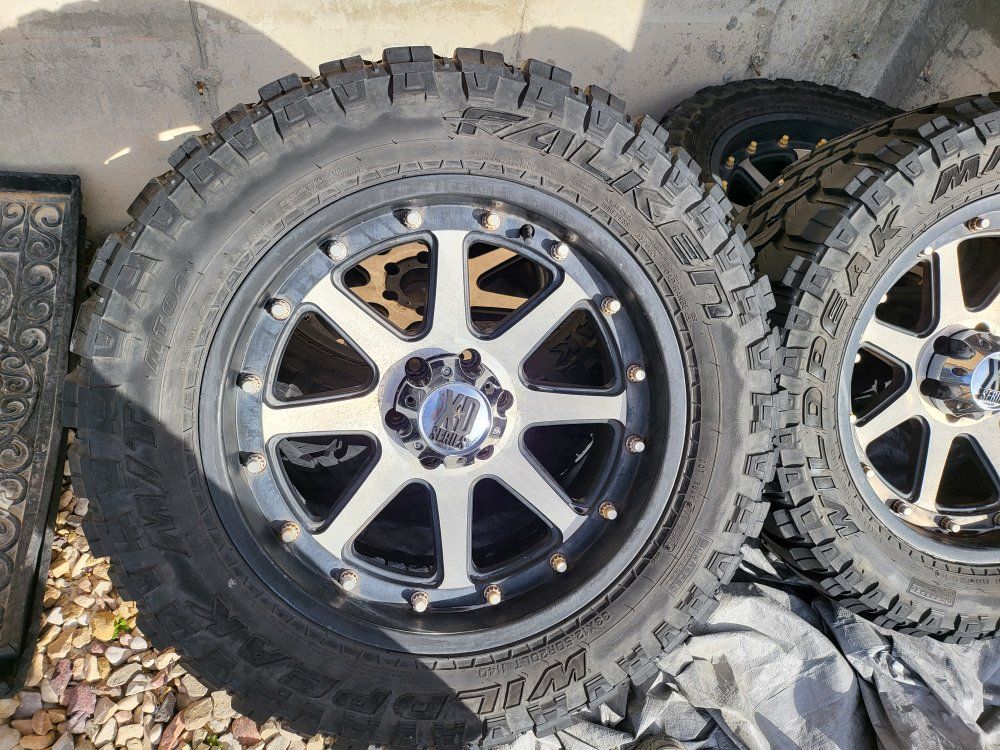 20"XD wheels that need a good cleaning some of the plastic chrome is peeling but will clean up nice I have all center caps and have 33" wild peaks mounted and balanced tires are awesome with 12/32 tread all have even wear these tires alone are $480each at Walmart this is a nice set ready to roll