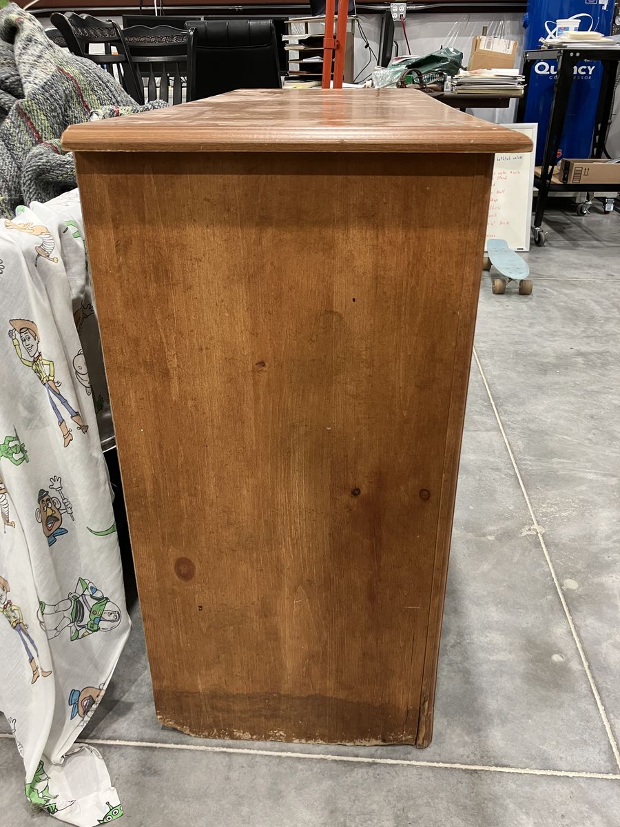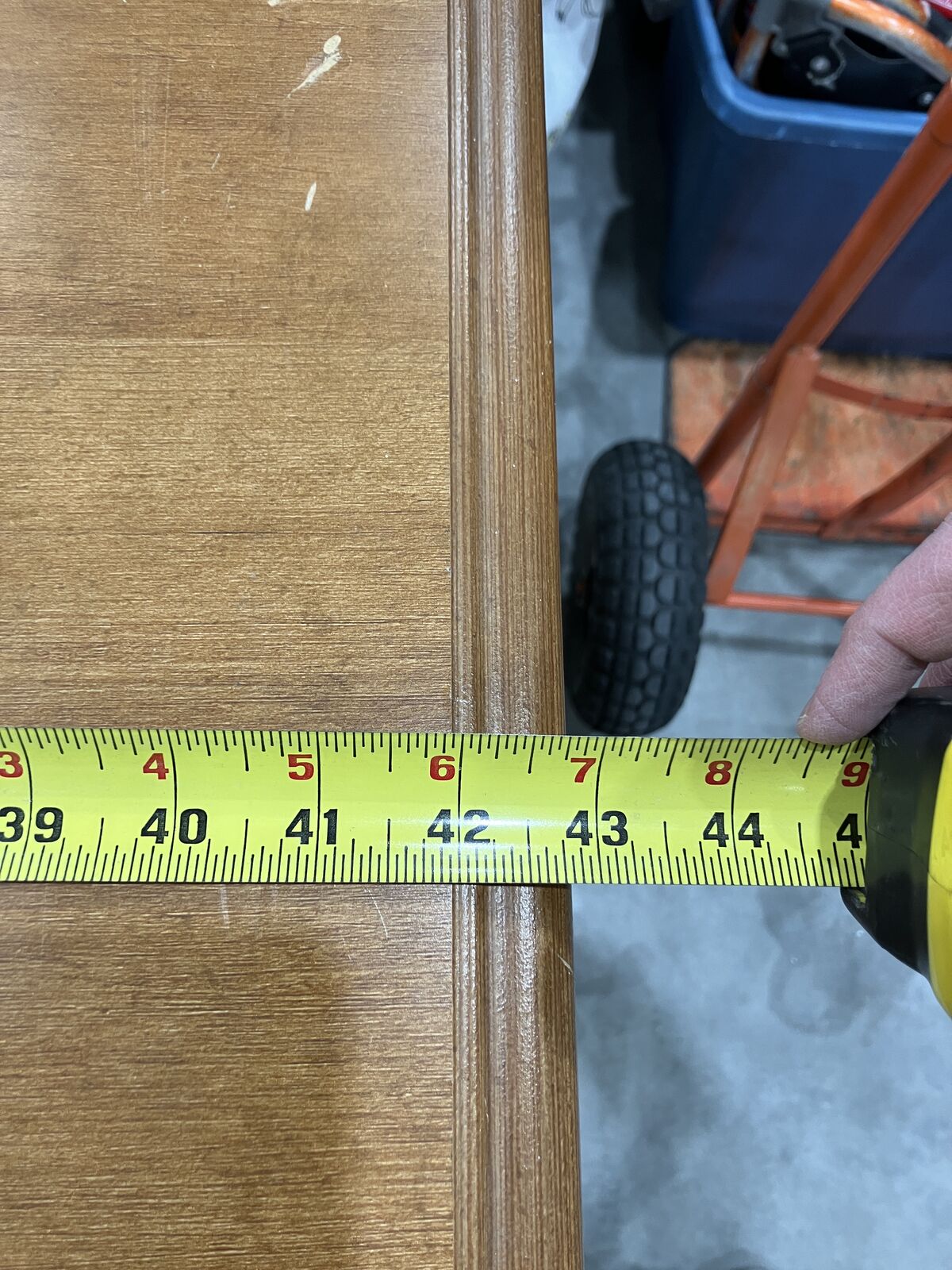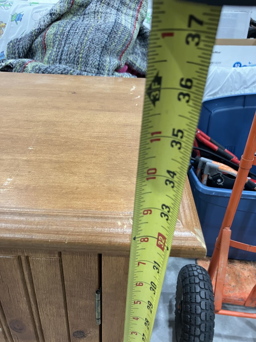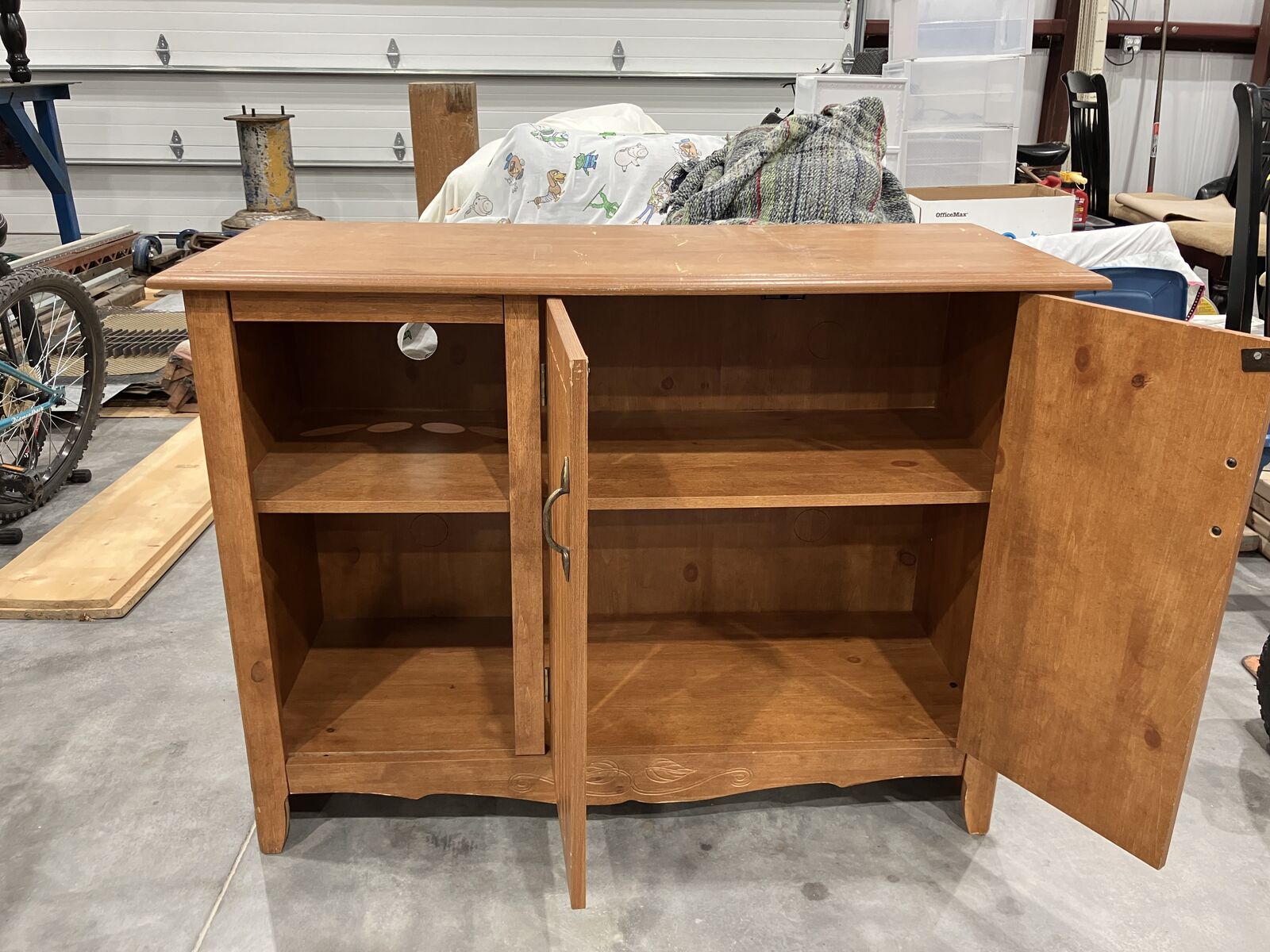 PayPal42" long, 16" deep, and 32" tall with open and enclosed shelves. In good working condition with scratches on top.