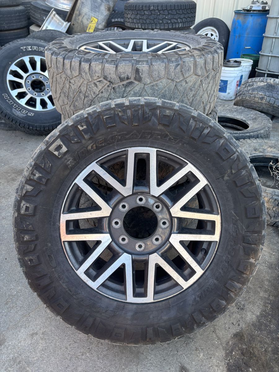 I am selling these Lariat Ultimate wheels! One of the best looking stock wheels ford has offered. They come on some worn out Nitto ridge grapplers 35x12.50s. They have little tread but would get you by in a pinch they are missing 2 hub caps. 700 obo shoot me an offer!