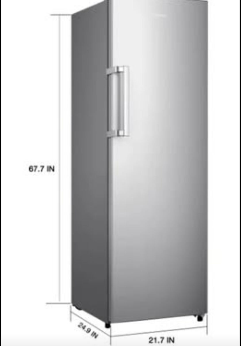 Convertible freezer/refrigerator with one-touch mode switching between freezer and fridge; garage-ready performance designed to operate between 0F and 110F in freezer mode; seal break handle for effortless door opening; Energy Star certified for efficiency; reversible door installation; convertible and garage-ready features; freezer capacity 10.2 cu ft; overall dimensions 21.7W x 24.9D x 67.7H LOC-MY. tiny little ding which is why its a lower price then retail
