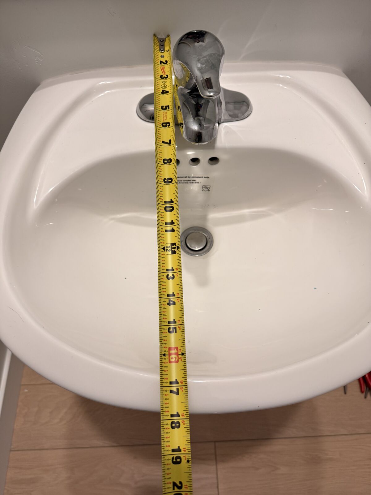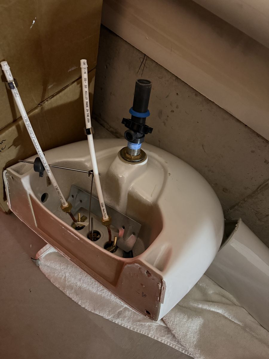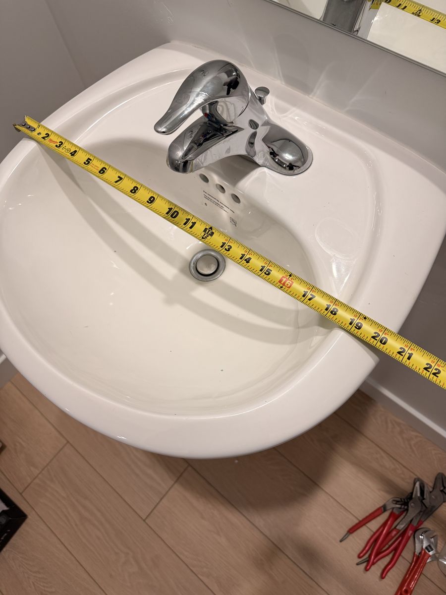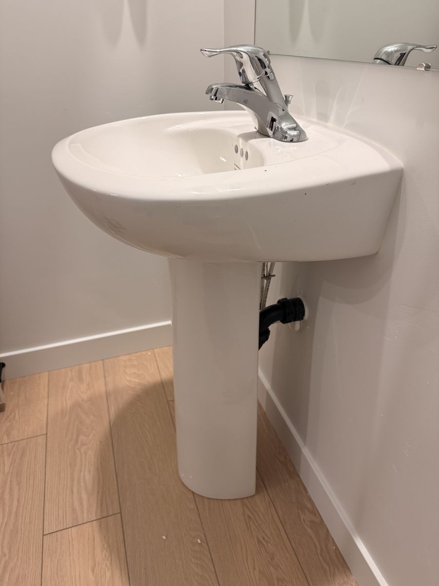Sink comes with faucet, drain piece, water lines seen in photo and metal bracket.