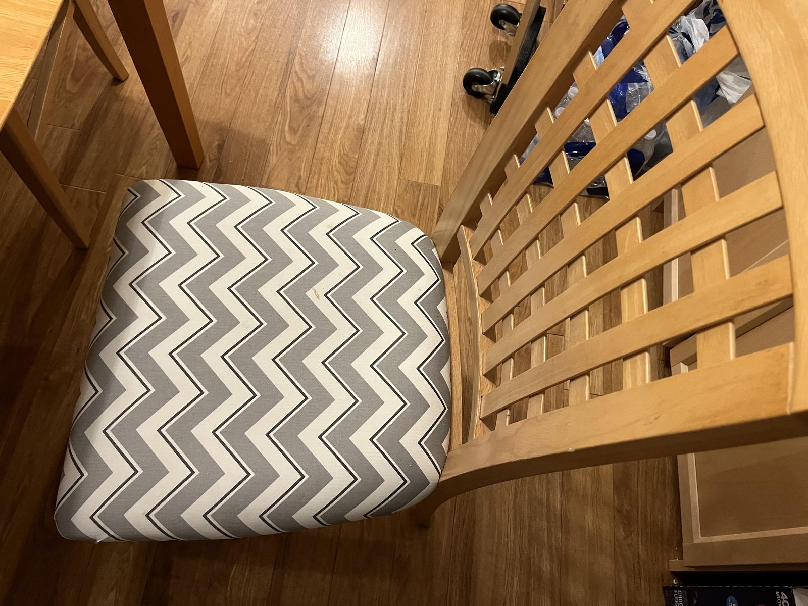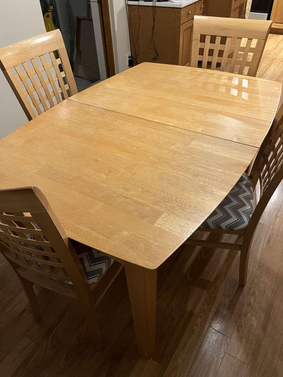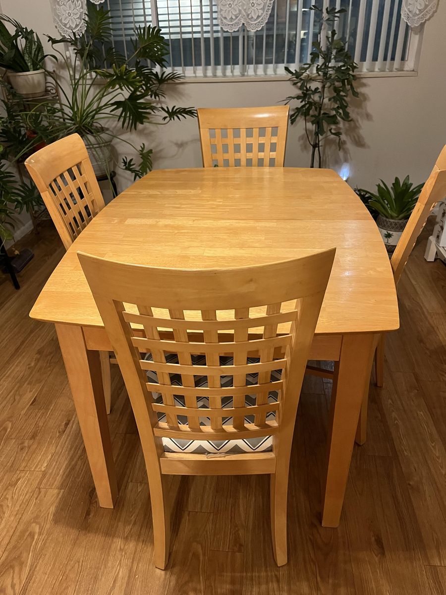 VenmoSturdy, solid wood dining room table and four upholstered chairs. No rips or tears in chair upholstery.