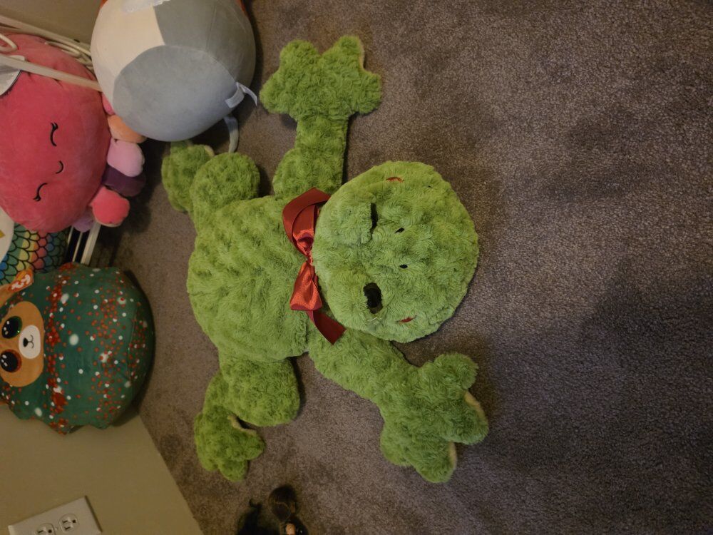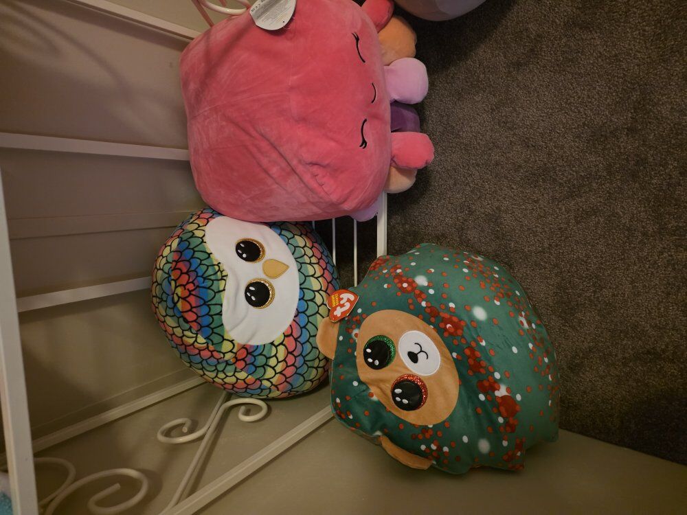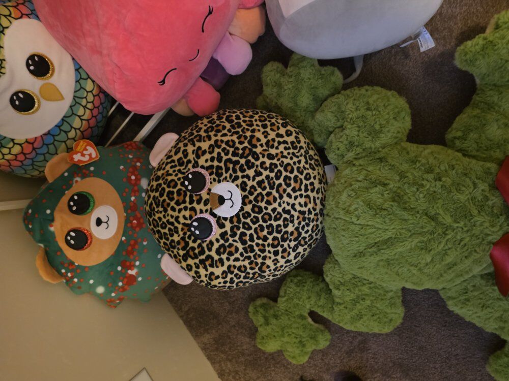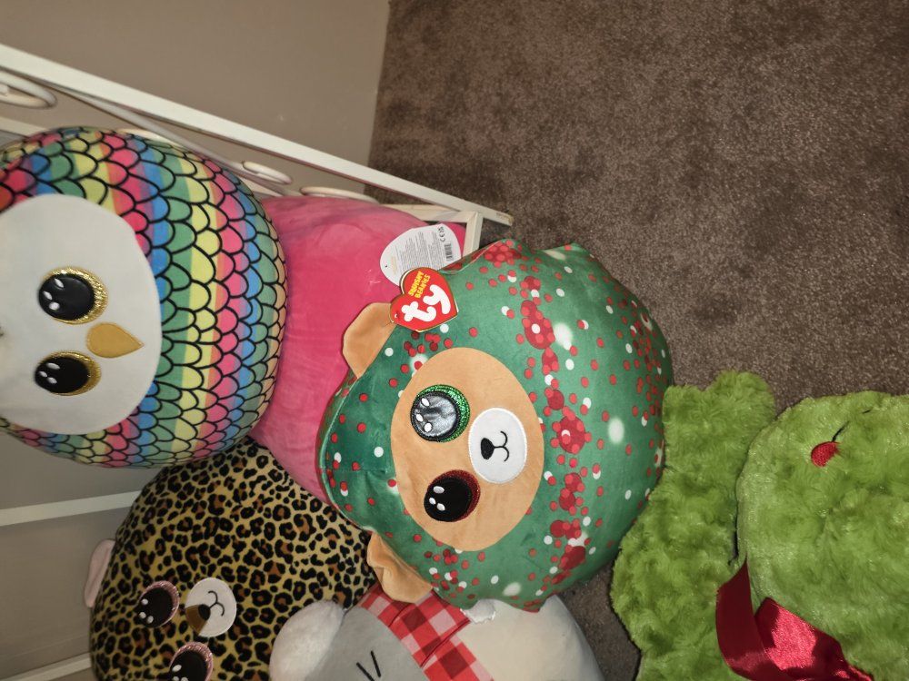 GooglePayAdorable plushie collection here! Got a big green frog with a red bow, a festive Ty Beanie Boos Christmas bear, a colorful owl, a leopard print plushie, and a cute grey mouse with a scarf and earmuffs as well as a super cute pink octopus. All clean and well cared for.