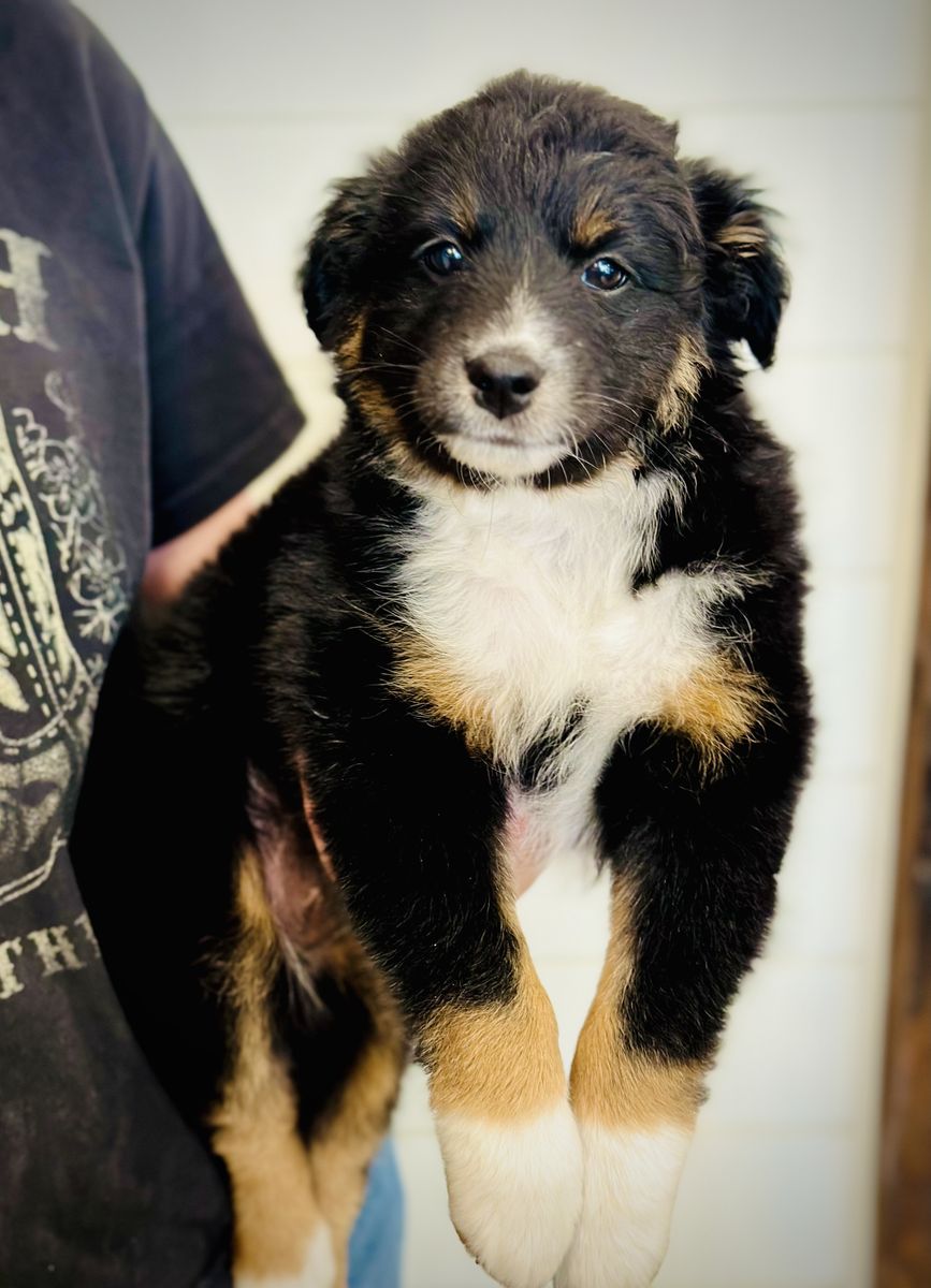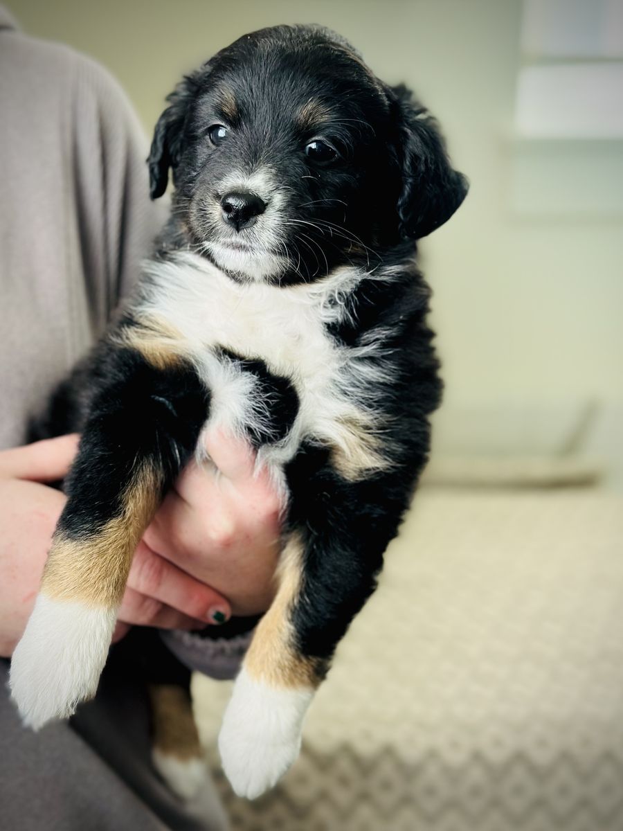 VenmoMini Aussie Bernedoodle Puppy (also known as Mini Aussie Mountain Doodles). 3/4 Mini Aussie - 1/8 Bernese - 1/8 Poodle. Litter of 5 Born January 6, 2026. One Handsome Male Available. Tail is docked and first vaccination has been given. Will mature to be 23-27 lbs. and 16"-18" tall. Located in Cedar City, UT