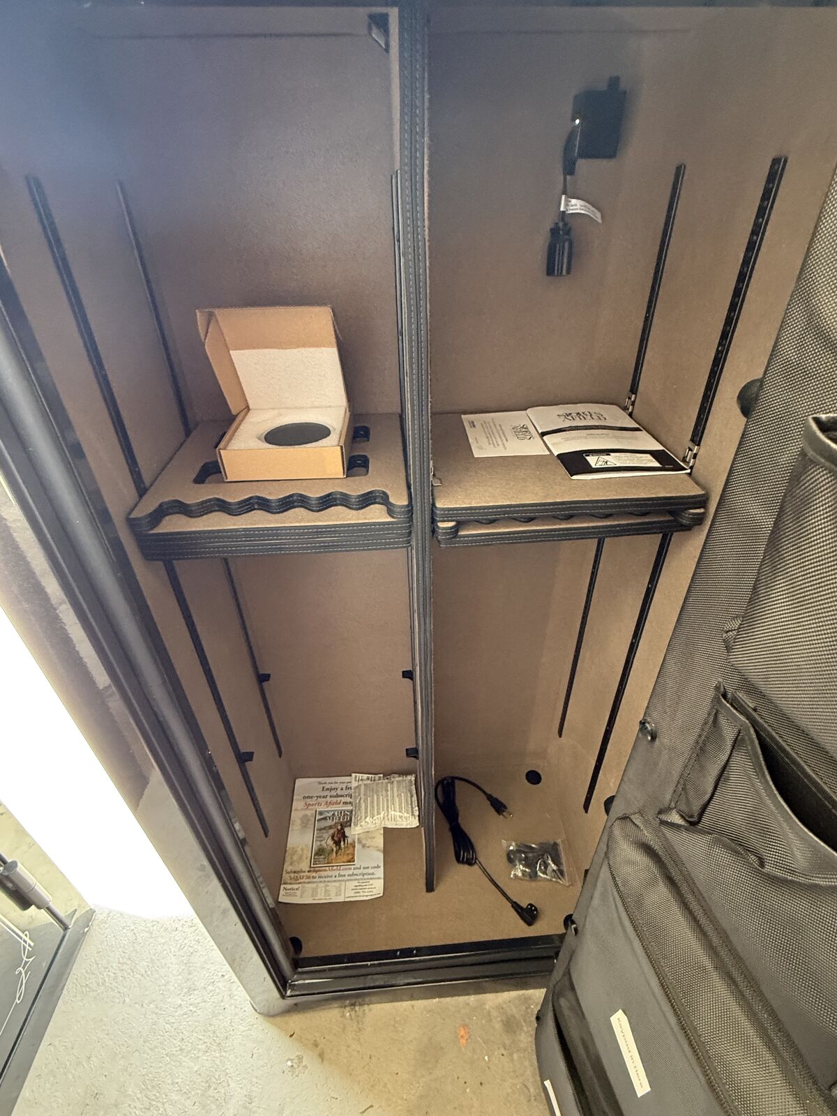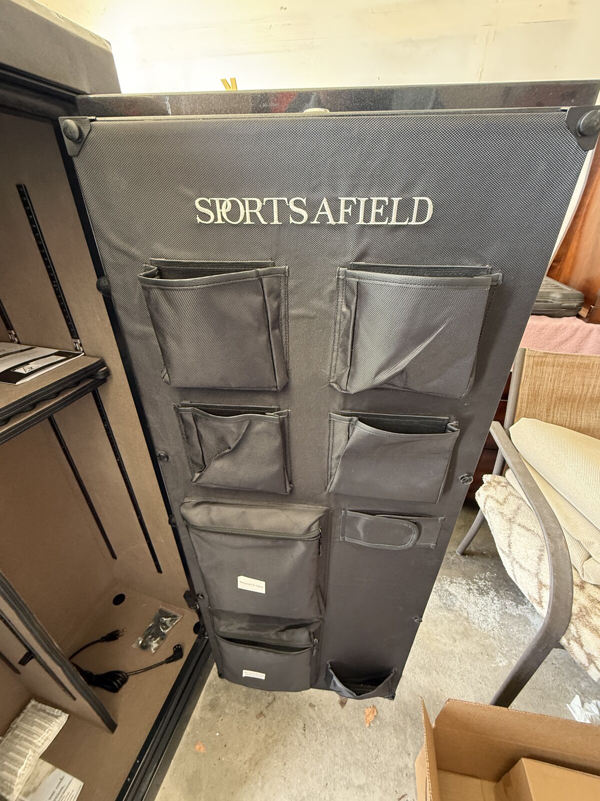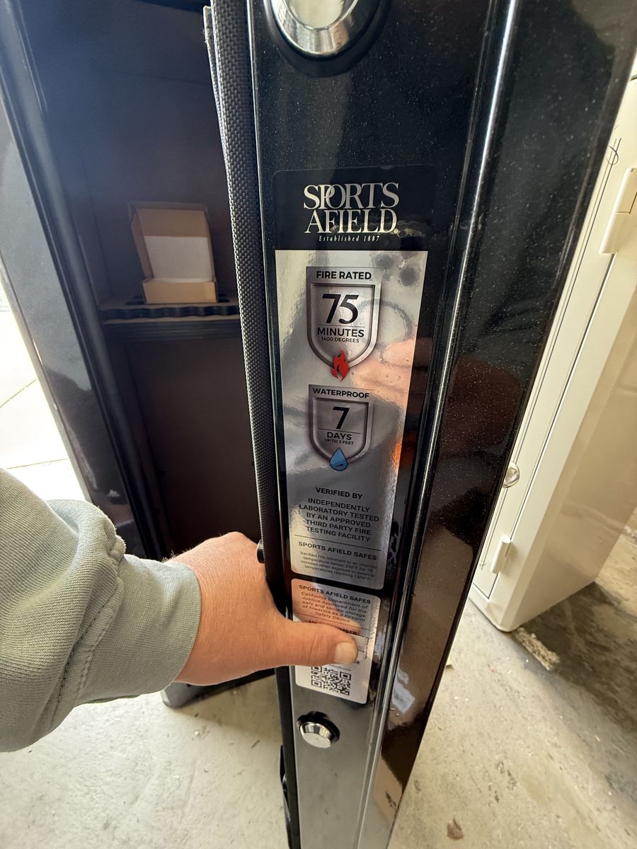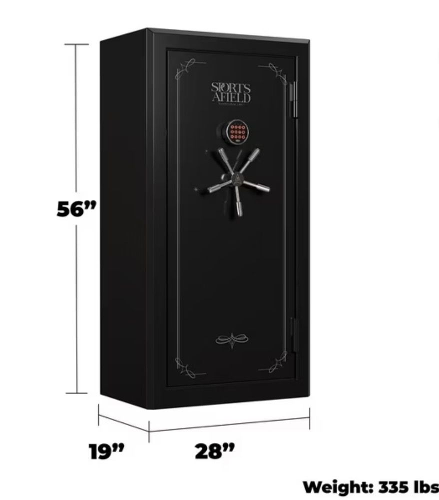 VenmoBrand new 32 gun Sports Afield safe. Gloss black metallic color. This one has a dent on the bottom front left corner and the door is a little sticky to open and close. Everything works properly. Spec's and details below. Asking $650. Text with questions.