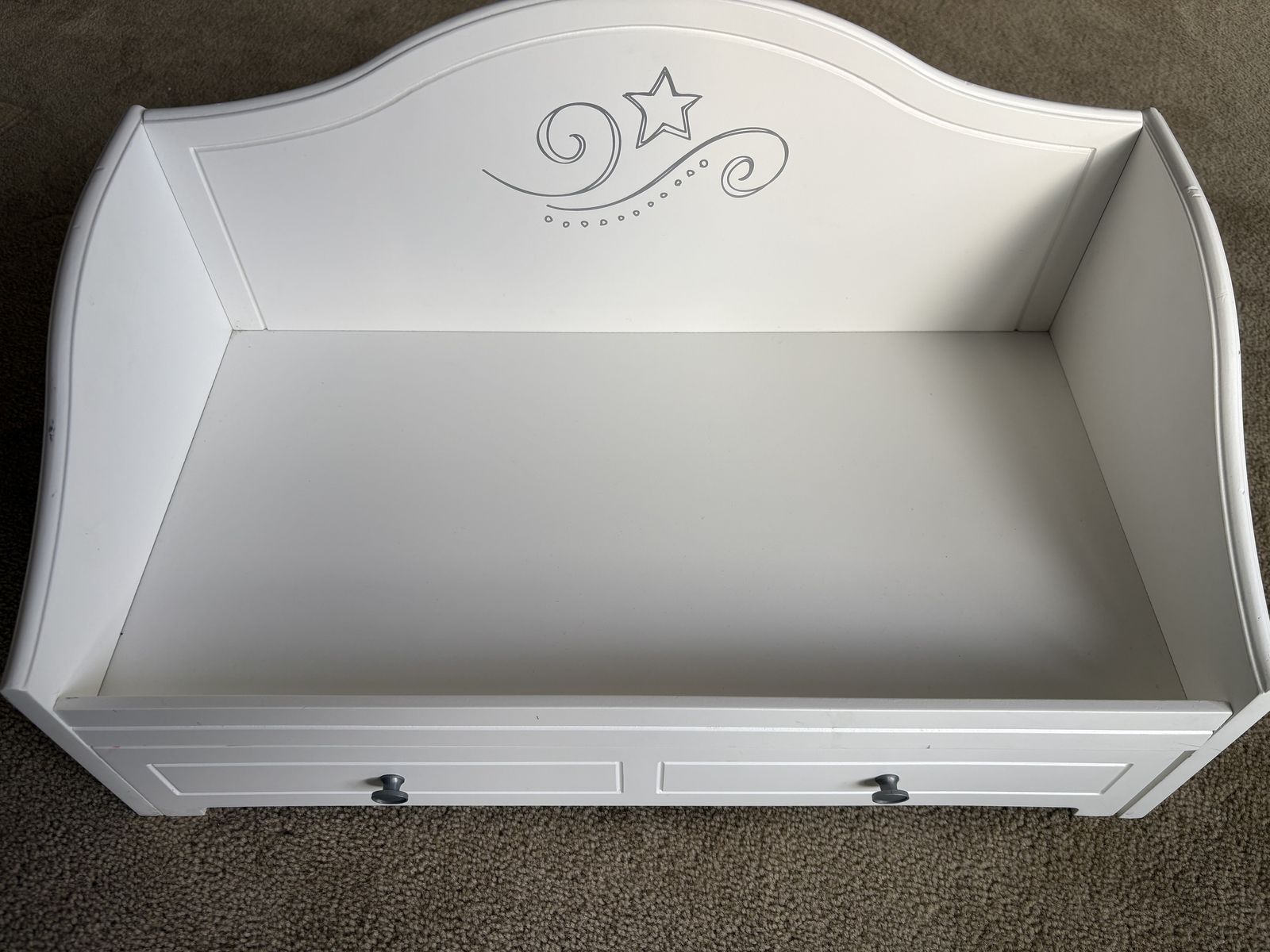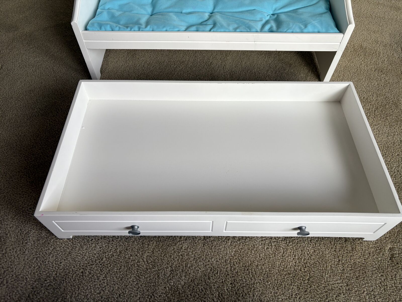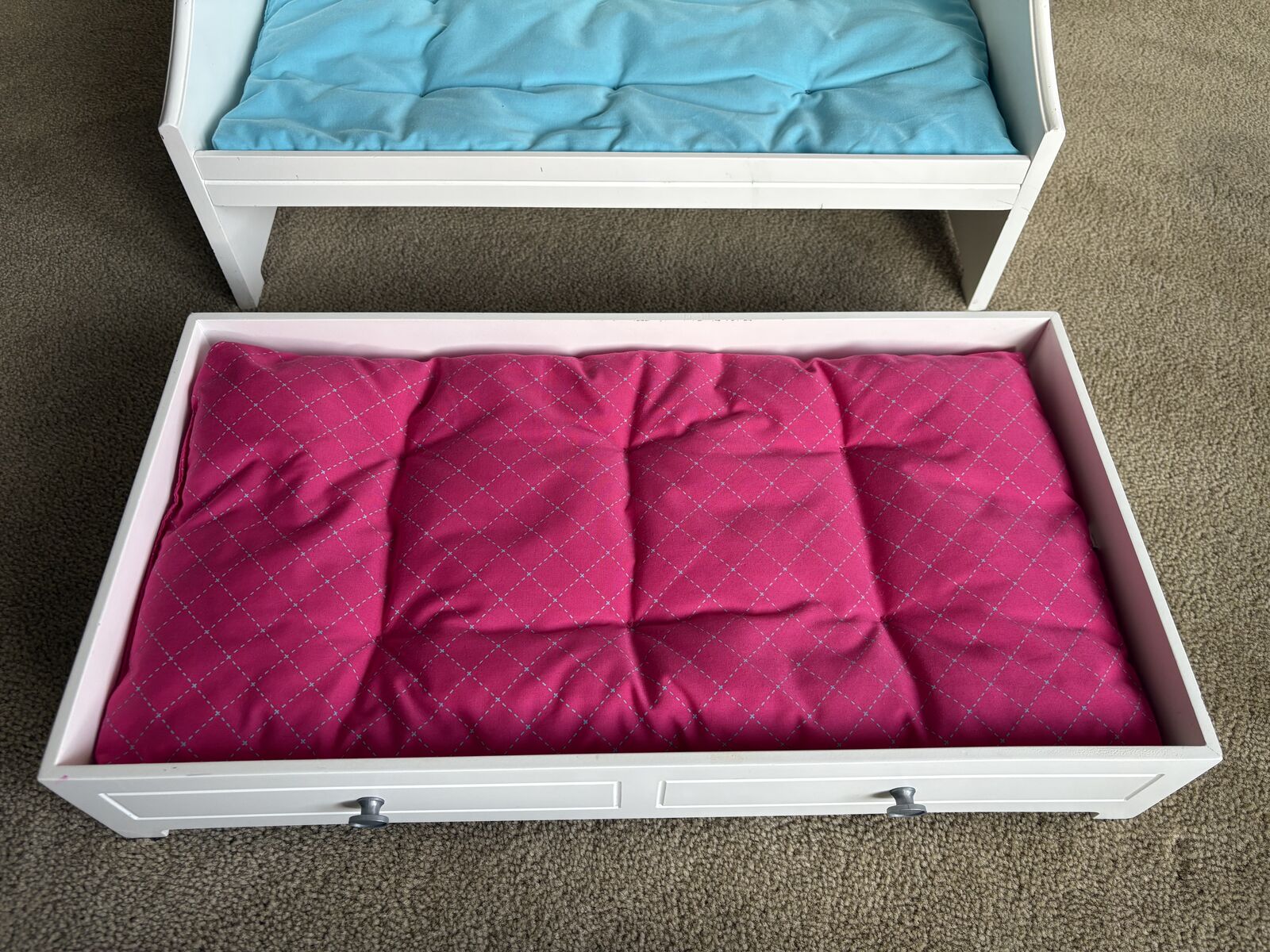 Genuine American Girl Trundle Bed, for 18” dolls. 2015. Painted wood, pull-out trundle drawer, soft mattresses. High-quality, sturdy construction, very good condition (a few small scuffs, see photos). Text only. Cash or Venmo.