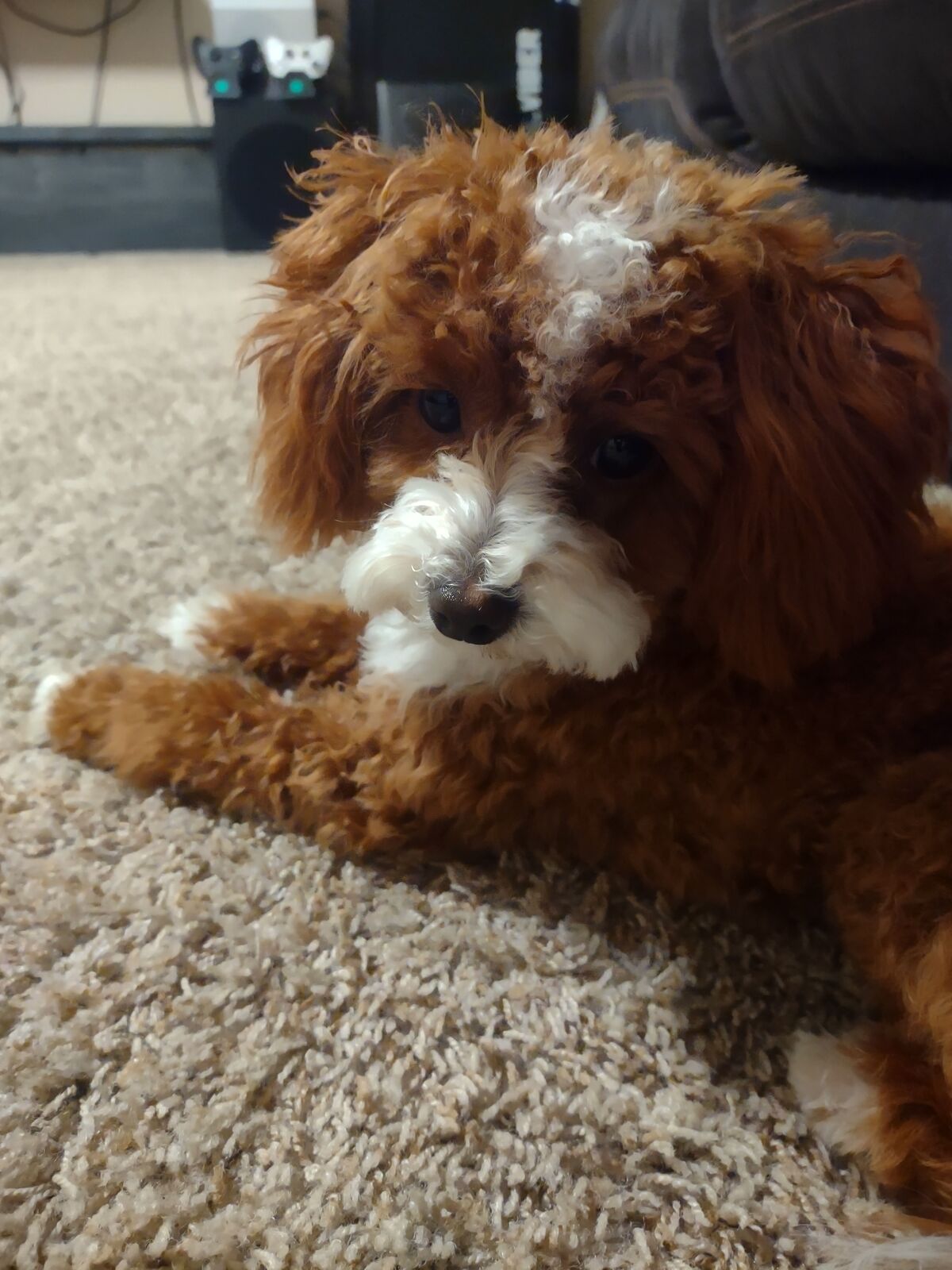 ApplePayOur beautiful micro golden doodle, Phoenix had two gorgeous little pups. This is her first litter and she has become the best mamma ever! She had a boy (Nick) and a girl ( Judy). Both these pups are available as of right now. The mom (Phoenix) is the one in the 3rd picture. She weighs 7lbs and has no white spots on her. The dad (Copper) is in the 4th picture and he weighs 5lbs and has many white patches on him. These pups are hypoallergenic which means they don’t shed. And they are ready to go home April 18.