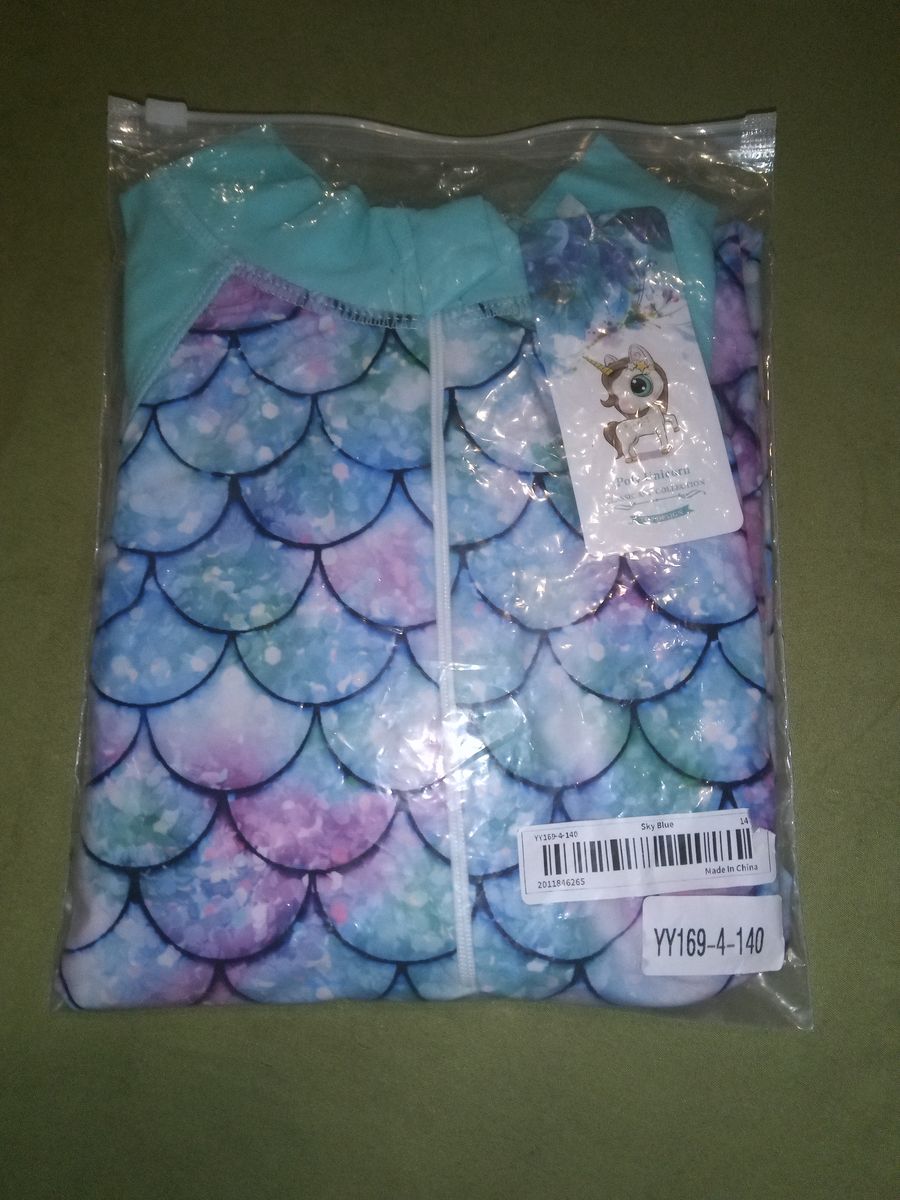 CashAppSize 140. Brand New. Girls' one-piece mermaid-themed rash guard swimsuit. It features a colorful fish scale pattern on the body and contrasting solid-colored full sleeves. Key Features Design: A "boyleg" one-piece style with a front zipper for easy dressing and a mock neck for added coverage. Sun Protection: Most versions are rated UPF 50+, providing high UV protection for outdoor water activities. Material: Made from a quick-drying blend of polyester and spandex (or polyamide), offering 4-way stretch for comfort. Activities: Suitable for swimming pools, beaches, and surfing