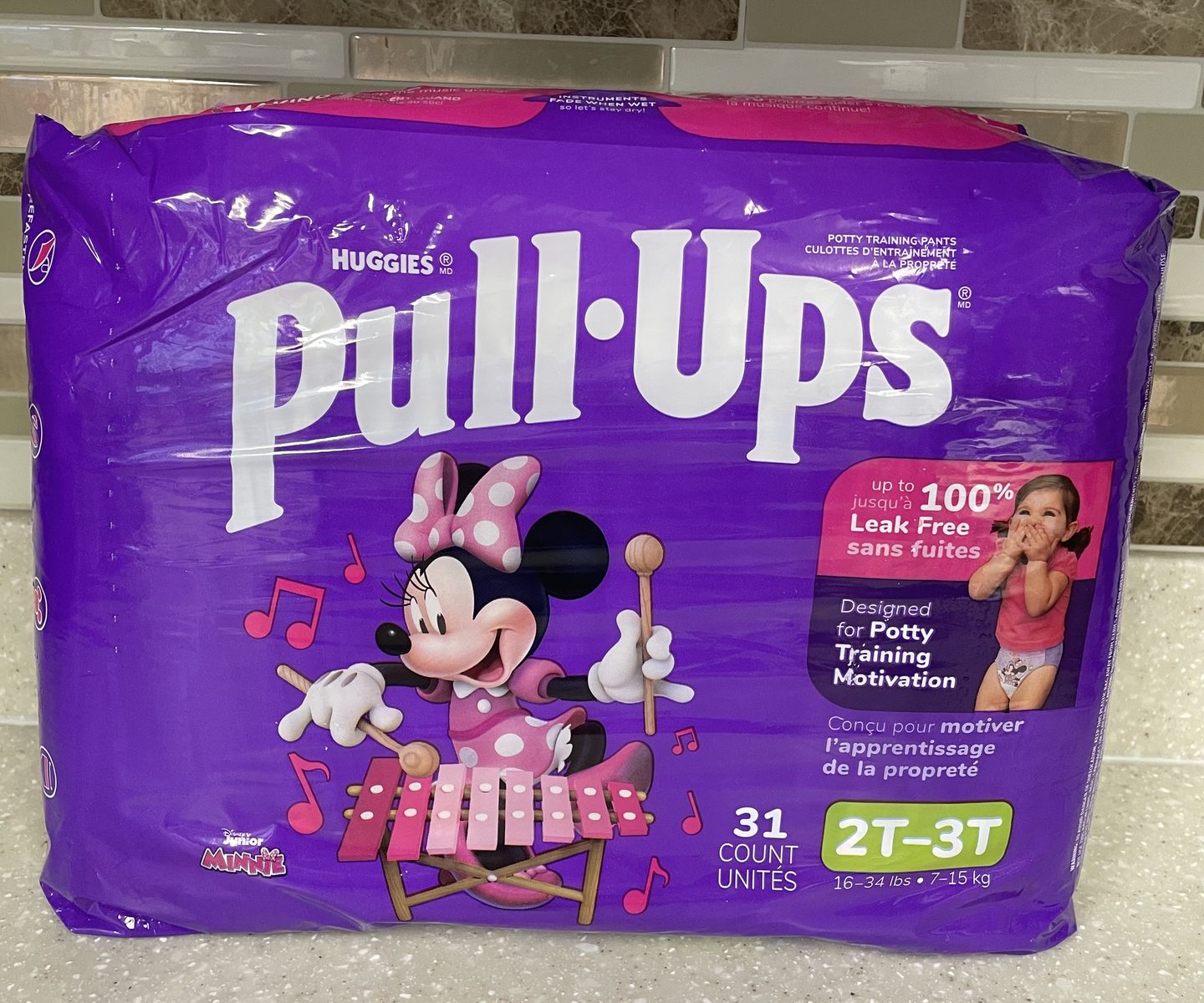VenmoHuggies Pull-Ups Learning Designs Training Pants for Girls in Disney Minnie Mouse theme, size 2T-3T, featuring re-fastenable sides and leak protection. I have 2 of these packages.