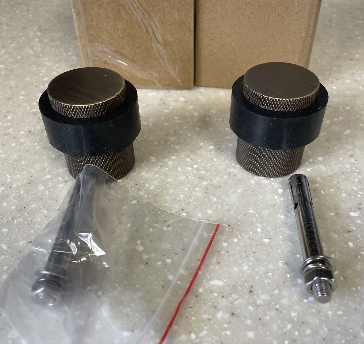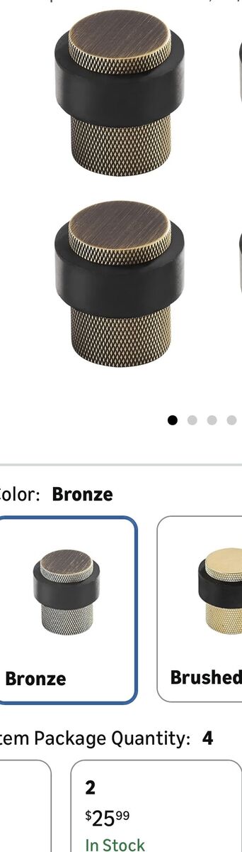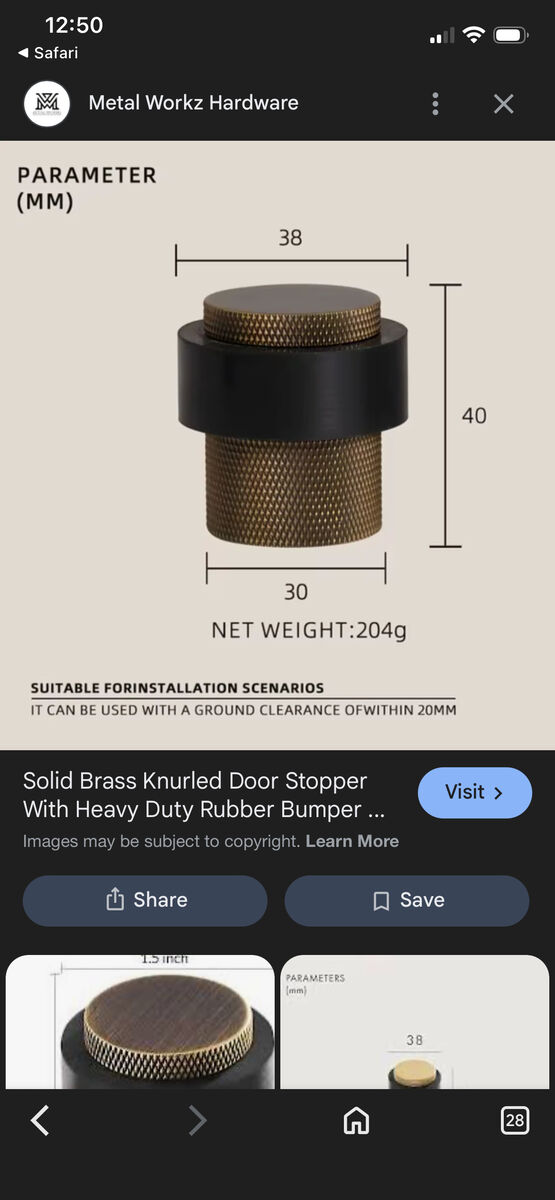 VenmoBronze Knurled Door Stopper by Metal Workz Hardware. • Dimensions: 38mm diameter top, 30mm diameter base, and 40mm height. • Weight: Net weight of 204g. • Installation: Suitable for ground clearance within 20mm. • Features: Made of bronze with a knurled texture and a heavy-duty rubber bumper. I 2 of these, $10 for both.