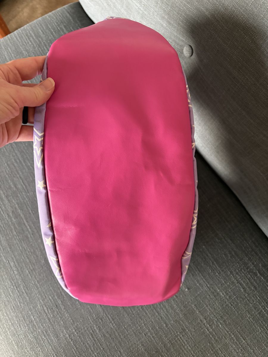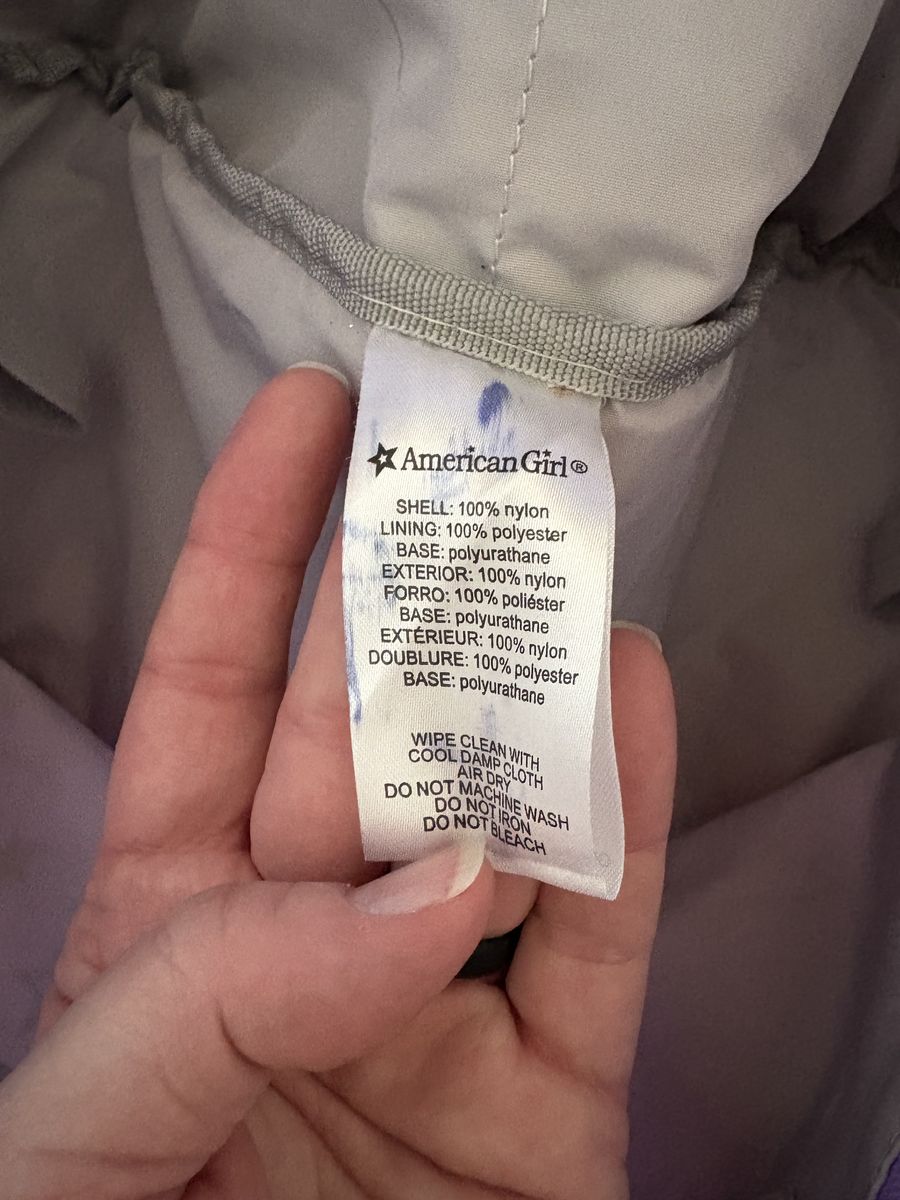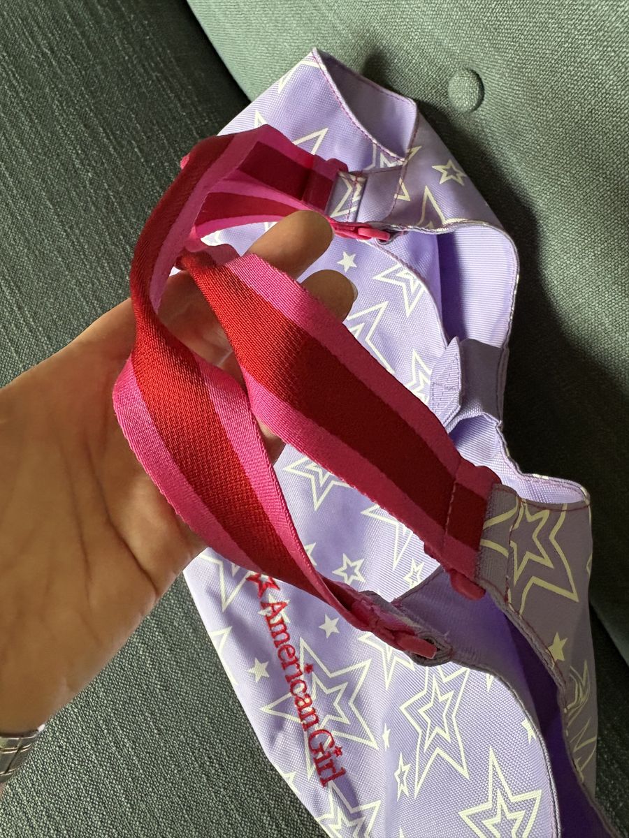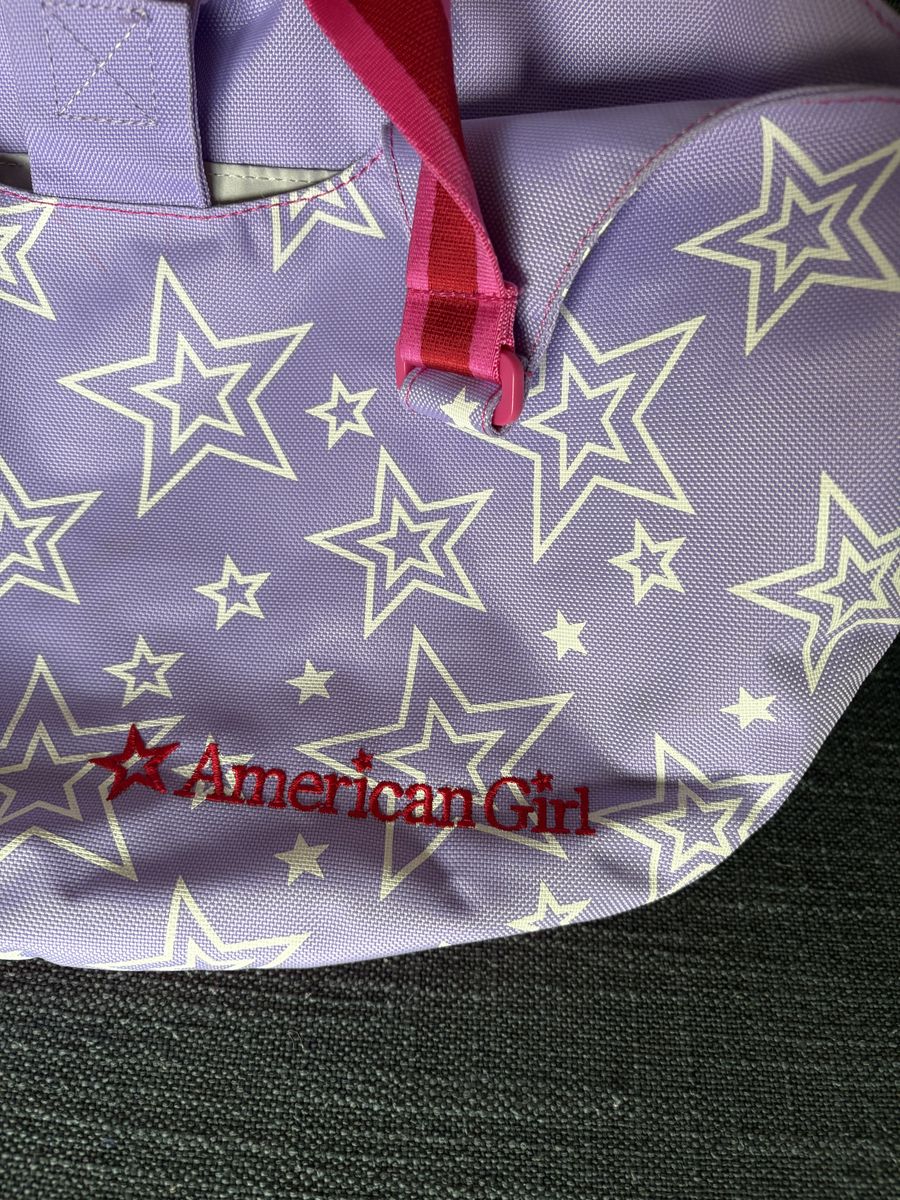 Genuine American Girl Lavender Doll Tote Bag. Lavender/pink/white, pockets inside and out, polyester, fits 2 seated 18” dolls. Very good condition. Text only. Cash or Venmo.