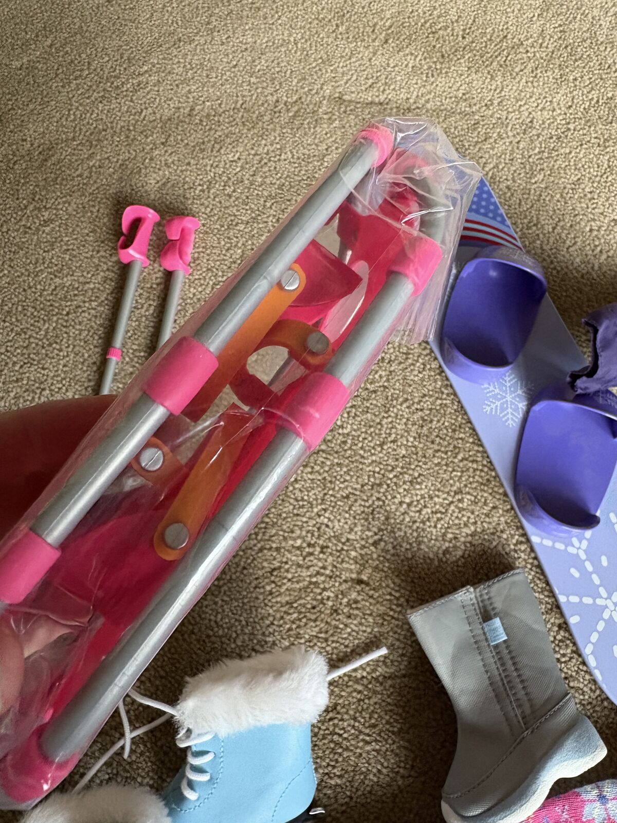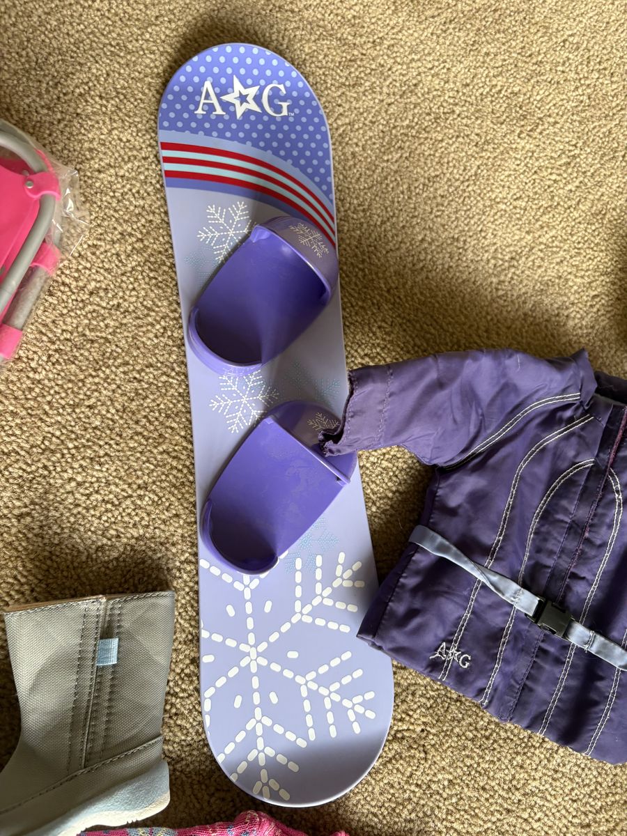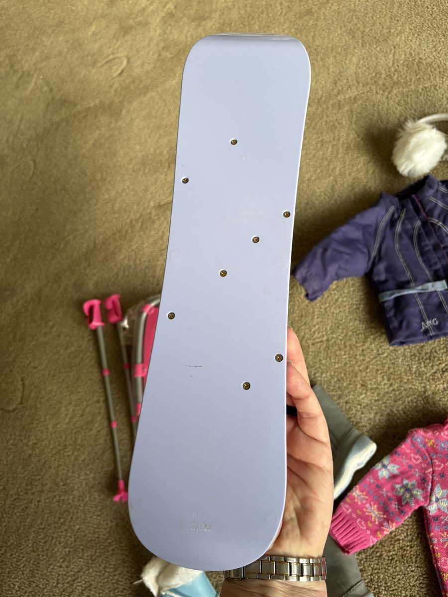 Genuine American Girl Doll Snow Set, for 18" dolls. Includes everything shown in photos: snowshoes, snowboard, poles, boots, outdoor clothing, and accessories. High quality, very good condition. Text only. Cash or Venmo.